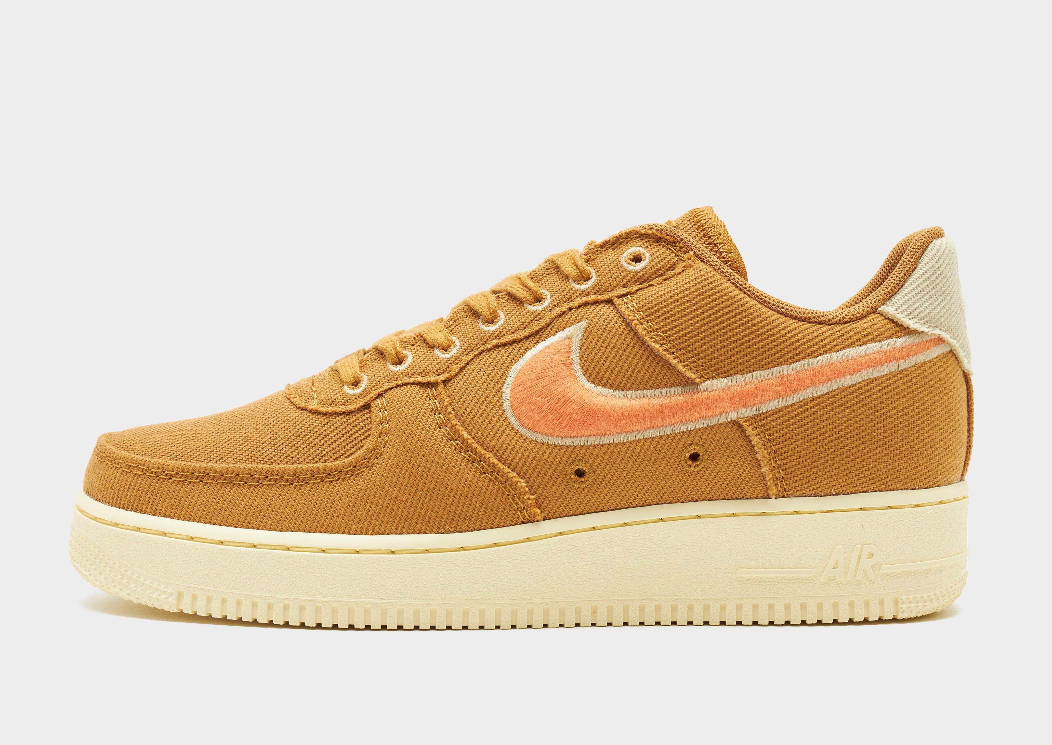 Timeless Swoosh gets a refresh with these men's Air Force 1 Canvas sneakers from Nike. In a Tan colourway, the durable canvas upper is breathable, textured and comfy, while the Hemp foam midsole houses a Nike Air unit for lightweight cushioning. They feature a tonal lace fastening and padded ankle collar. With heritage hoops pivot circles in the rubber outsole for grip, these trainers are finished with Orange Swooshes to the sidewalls. Style Code: HV1204-700