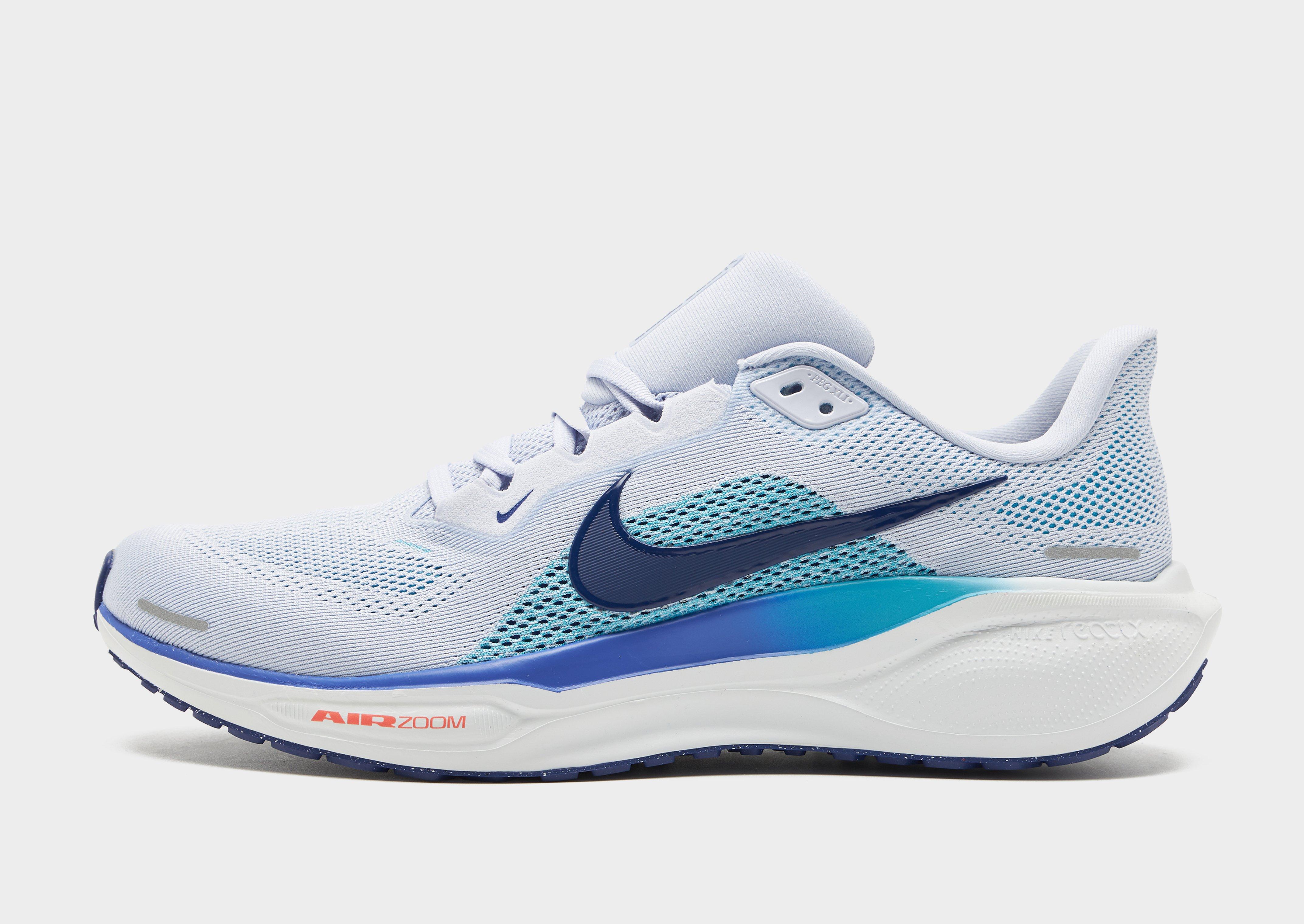 Get moving with these men's Pegasus 41 running shoes from Nike. Landing in a Grey colourway with Blue details, these runners have a breathable mesh upper to keep your feet cool when you're striding for PBs. They feature a lace fastening to secure the fit, and a low-cut padded ankle collar to keep you feeling snug. Underfoot, a partly recycled ReactX foam midsole works with dual Air Zoom units to provide responsive cushioning, while the rubber outsole ensures you're gripped to the surface. Perfect for those beginning their running journey, experts, or for everyday wear. Signed off with the Swoosh to the sidewalls. Style Code: FD2722-014