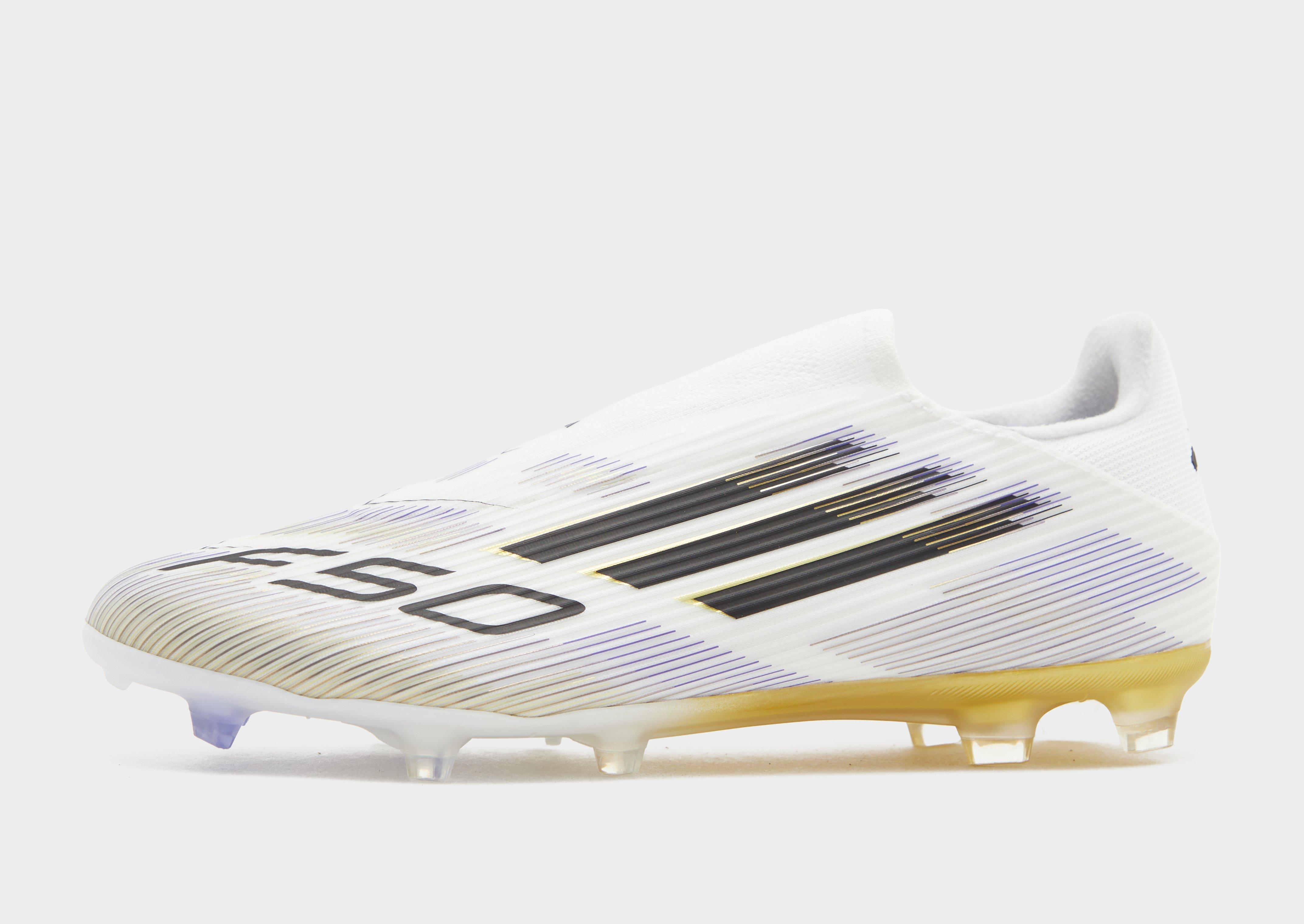 Bring pace on the pitch with these men's F50 League Laceless FG football boots from adidas. In a Cloud White colourway with Core Black and Gold Metallic accents, these laceless boots have a Fiberskin upper with a Sprintgrid print for total ball control. They have a laceless knit collar to keep you locked in, and a Sprintplate 360 outsole so you can make quick cuts on the pitch. Finished up with the signature 3-Stripes on the sides, a Performance logo on the heel, and F50 branding throughout. | JH7736