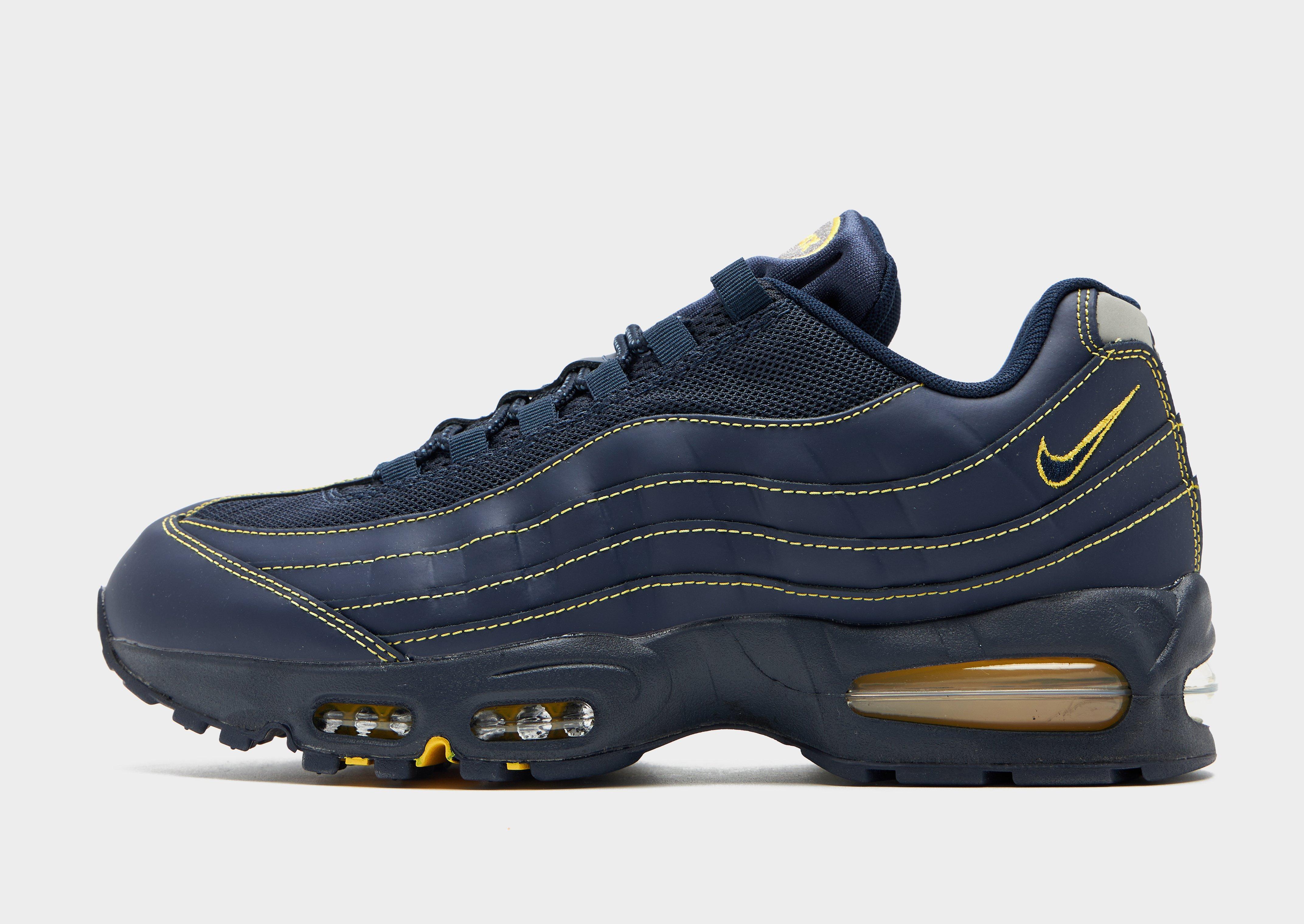 Step out in a Swoosh OG with these men's Air Max 95 shoes from Nike. Landing in a Michigan Navy colourway with Yellow details, these sneakers have airy mesh through the upper with real and synthetic leather for lasting wear. With stitched overlays to create the iconic wavy design lines, they have a lace fastening with a low-cut, padded ankle collar for a secure fit. They have visible Air units underfoot to cushion every step, with a remixed big bubble to the heel. They have a tough rubber outsole for grippy traction, and are signed off with iconic Nike branding throughout. Style Code: IB7936-400