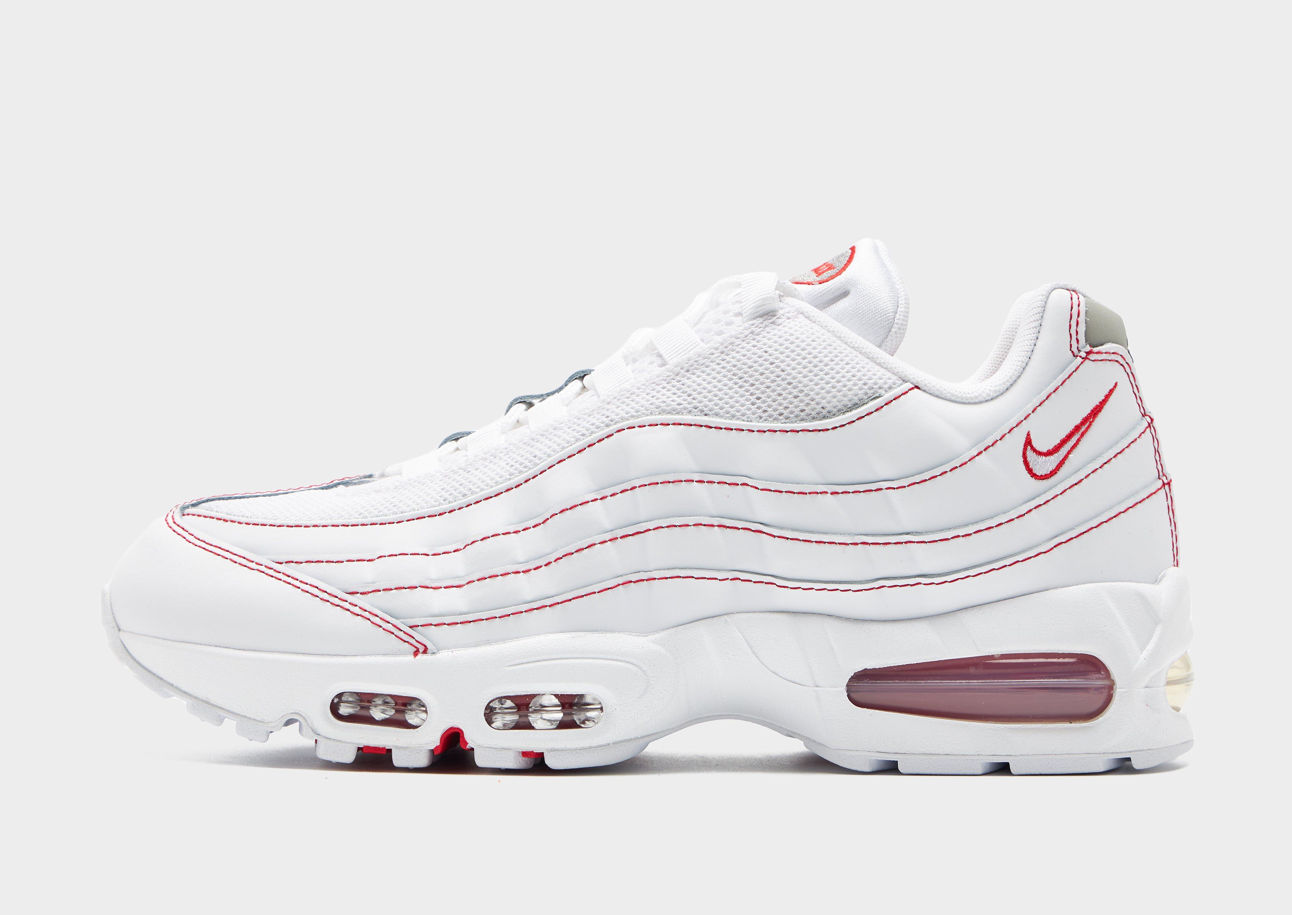 Step out in a Swoosh OG with these men's Air Max 95 shoes from Nike. Landing in a White colourway with Red details, these sneakers have airy mesh through the upper with real and synthetic leather for lasting wear. With stitched overlays to create the iconic wavy design lines, they have a lace fastening with a low-cut, padded ankle collar for a secure fit. They have visible Air units underfoot to cushion every step, with a remixed big bubble to the heel. They have a tough rubber outsole for grippy traction, and are signed off with iconic Nike branding throughout. Style Code: IB7936-100