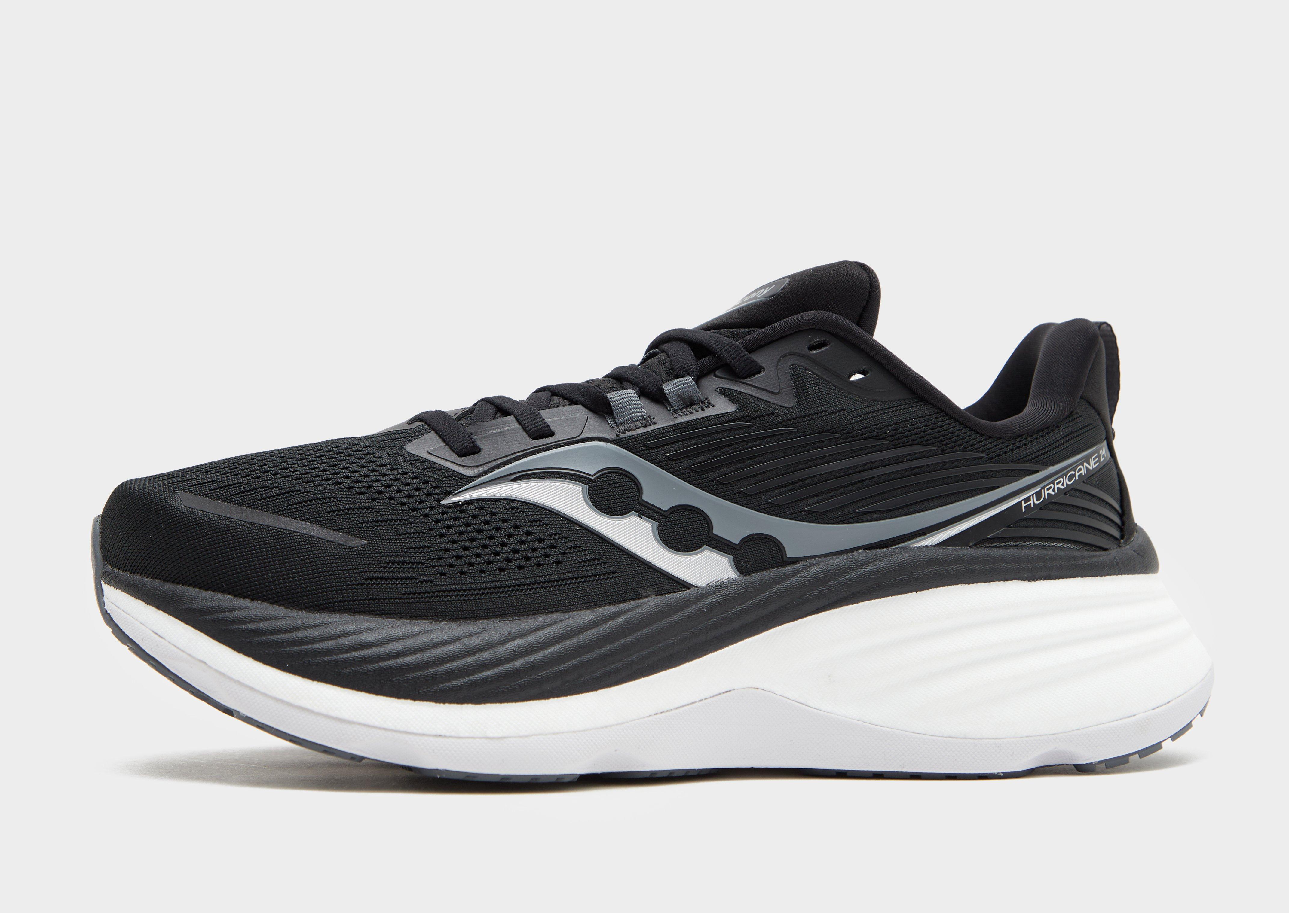 Rack up the miles with these men's Hurricane 24 trainers from Saucony. In a Black and Carbon colourway, these runners have a breathable engineered mesh upper to keep things cool as you push your pace. They have a lace fastening for a secure fit, and Centerpath Tech that features a broader base and higher sidewalls for extra protection and support. Underfoot, the dual cushioning system uses PWRRUN PB foam and PWW foam for max energy return, while the rubber outsole offers total traction. Finished up with signature Saucony branding throughout.