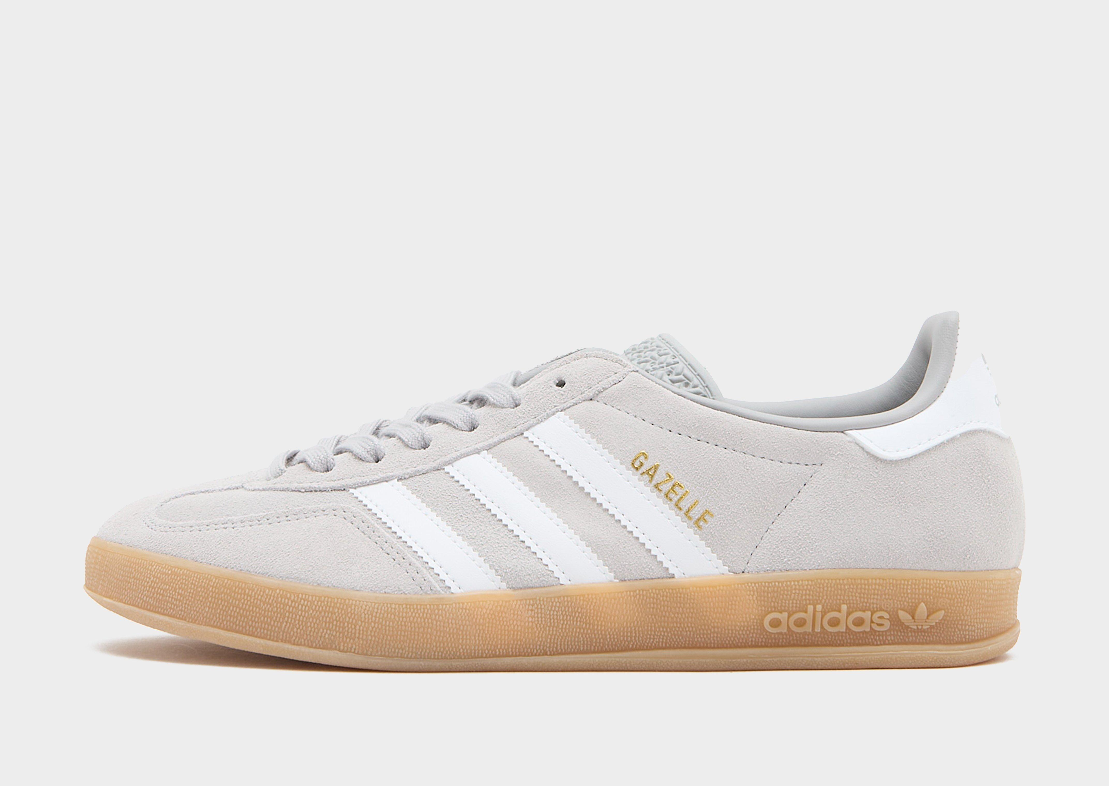 Same DNA, brand-new look. Step out with cues from a classic in these men's Gazelle Indoor sneakers from adidas Originals. In a Grey Two and White colourway, the suede and leather upper delivers a premium feel alongside the leather lining. They're sat above a cushioned insole and a translucent Gum rubber outsole with retro-inspired tread. Finished off with the 3-Stripes, the Trefoil logo, and Gold Metallic Gazelle branding. | JQ0176