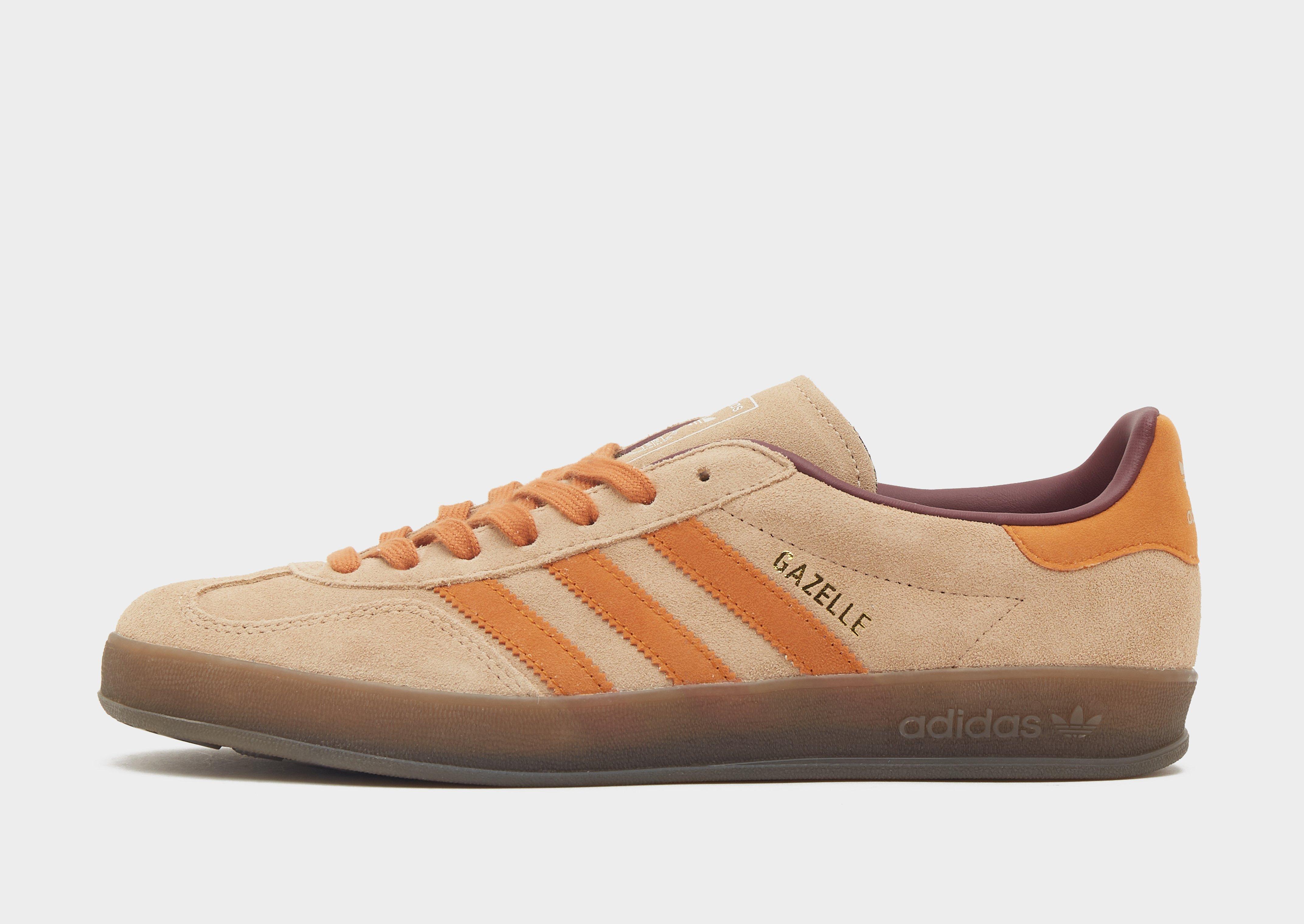 Step out in '70s inspired sneaks with these men's Gazelle Indoor trainers from adidas Originals. In a Warm Sandstone, Craft Ochre and Shadow Red colourway, these kicks have a smooth leather upper for durable wear. They feature a lace fastening to keep you locked, synthetic lining for extra comfort and a rubber outsole for total traction. Finished up with the serrated 3-Stripes and Gold Gazelle wordmark to the sidewalls and adidas Originals branding to the tongue and heel. | JH5412