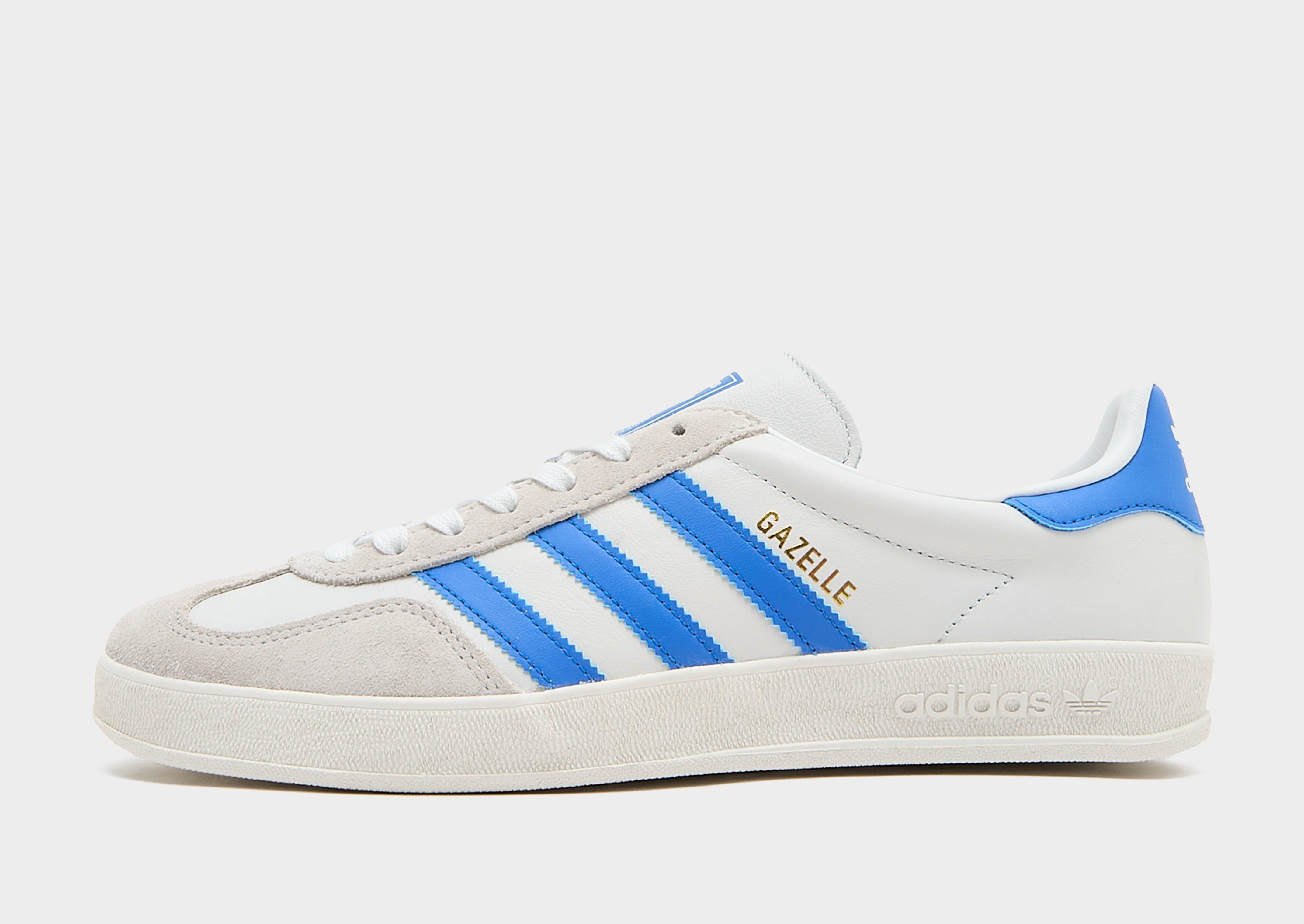 Sport a classic silhouette with these men's Gazelle Indoor trainers from adidas Originals. In a Crystal White colourway with Blue accents, these kicks have a smooth leather upper with a suede T-toe cap for lasting wear. They have a tonal lace fastening with soft padding around the collar, with light cushioning underfoot and a streamlined midsole for everyday comfort. With a tough rubber tread for traction, they're finished with signature adidas Originals branding throughout. | JH5408