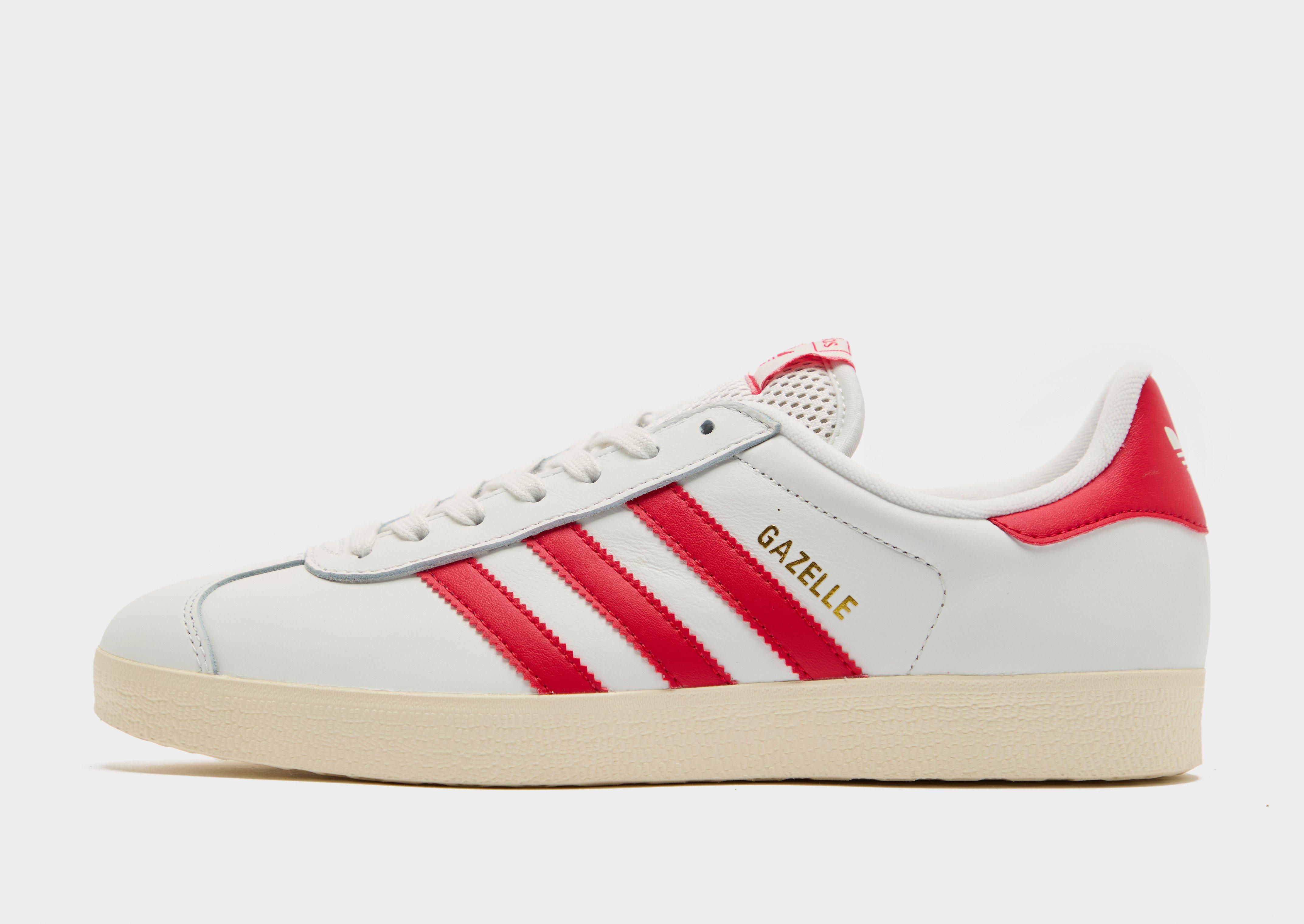 Keep it classic with these men's Gazelle sneakers from adidas Originals. In a Cloud White and Better Scarlet colourway, these sneaks are cut from smooth and durable suede for a premium feel. They feature a lace fastening to lock you in, with a padded collar for support, while underfoot, they sit on a grippy rubber outsole for traction. Finished up with classic 3-Stripes and Trefoil branding. | JH5399