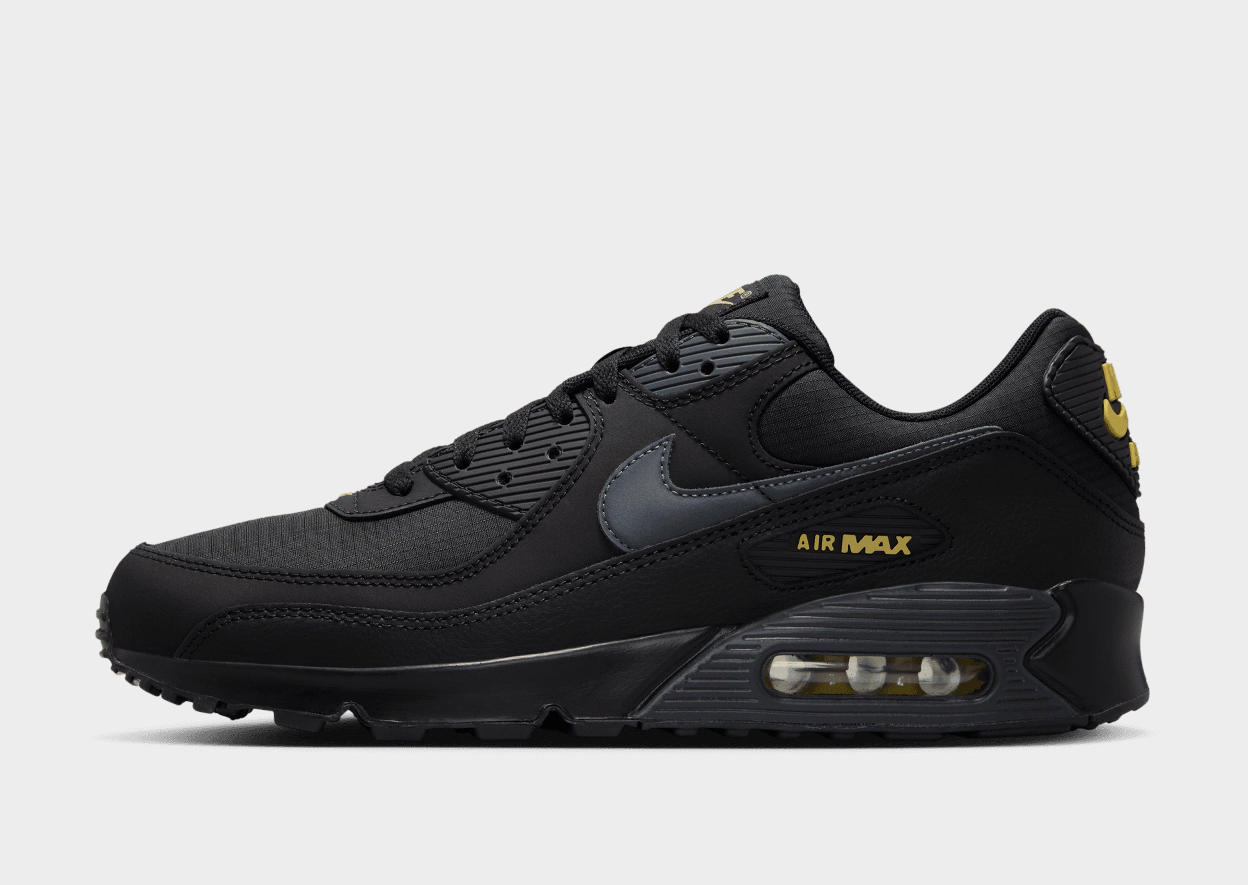Giving Tinker Hatfield's '90 OG an upgrade, these men's Air Max 90 shoes from Nike are streetwear essentials. In a Black colourway with Gold details, these JD-exclusive sneakers are built with a premium leather upper for supreme support. Keepin' the same design lines as the classic, a tonal lace-up fastening keeps you locked in and a lightweight midsole with a visible Air unit in the heel brings a smooth ride and essential cushioning. With a grippy rubber tread underfoot, these shoes are finished with Air Max branding and a Swoosh to the sidewalls. Style Code: IB7680-001
