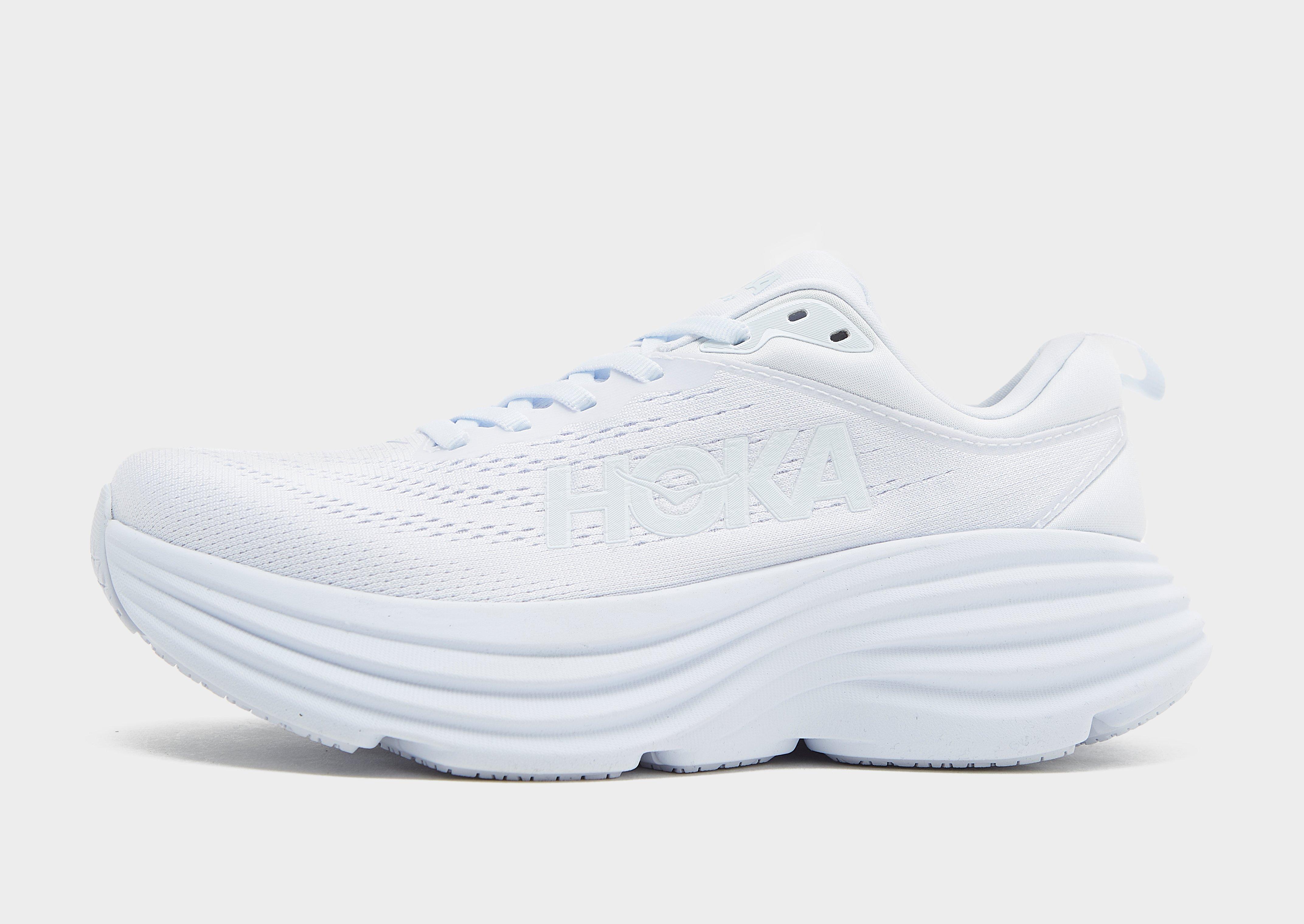 Rack up the miles in these women's Bondi 8 trainers from HOKA. In a White colourway, these runners have a breathable mesh upper for airy wear. They have a tonal lace fastening with padding around the ankle collar for a locked-in fit, and an Ortholite sockliner for extra stability. They sit above a stacked foam midsole for responsive cushioning, while a tough rubber outsole keeps you gripped. Signed off with classic HOKA branding.