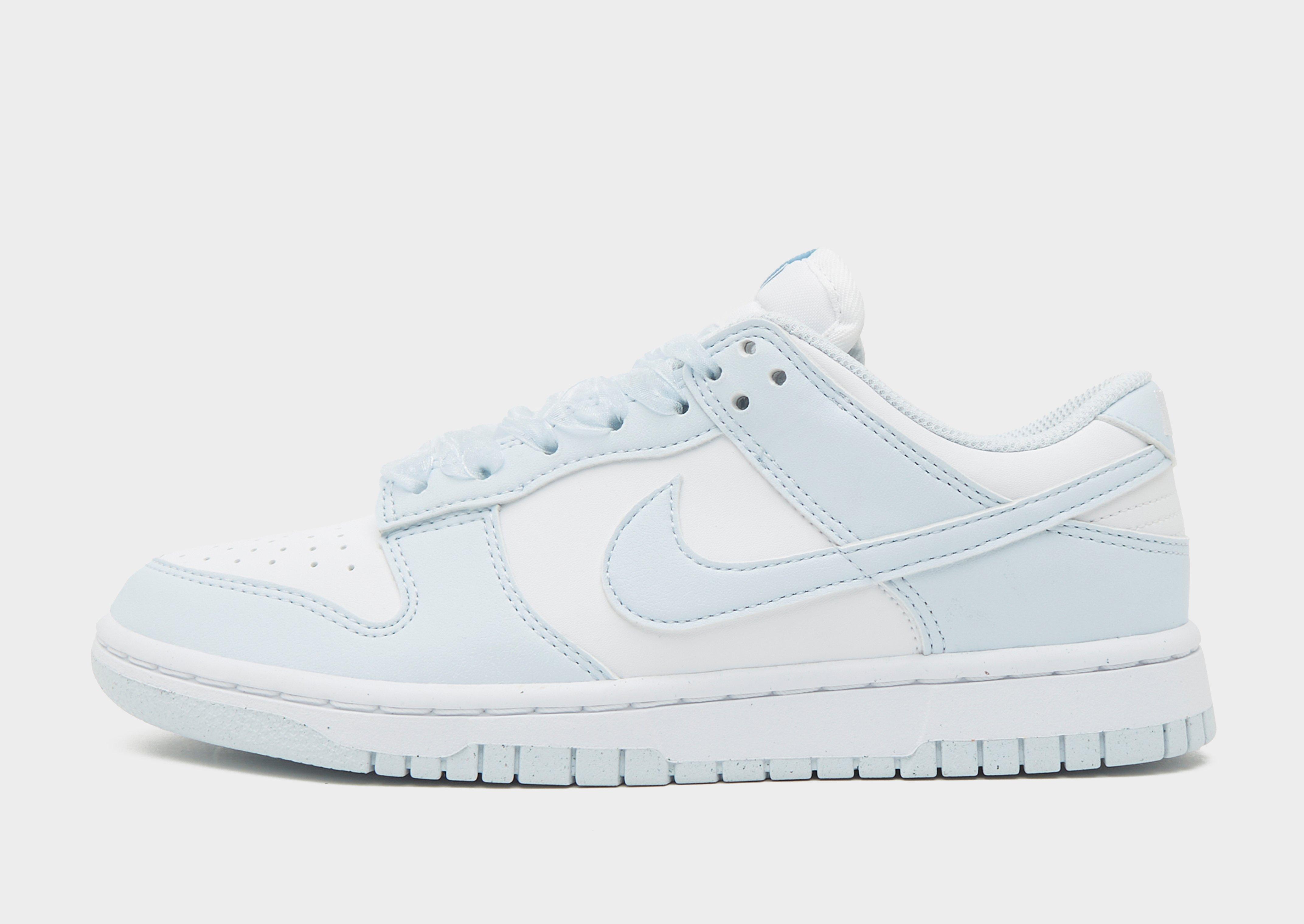 Step into a refreshed icon with these women's Dunk Low Lace trainers from Nike. In White and Blue Tint colour blocking, the soft yet hard-wearing leather upper features OG design lines and a perforated toe. They feature a padded ankle collar and a textile lining, while the sheer laces deliver an iced-out look. Underfoot, the cushioned foam midsole sits on heritage hoops pivot circles for old-school style and court-ready grip. Finished off with Nike wordmark branding embroidered to the heel tab and the Swoosh on the sidewalls. Style Code: IB7311-100
