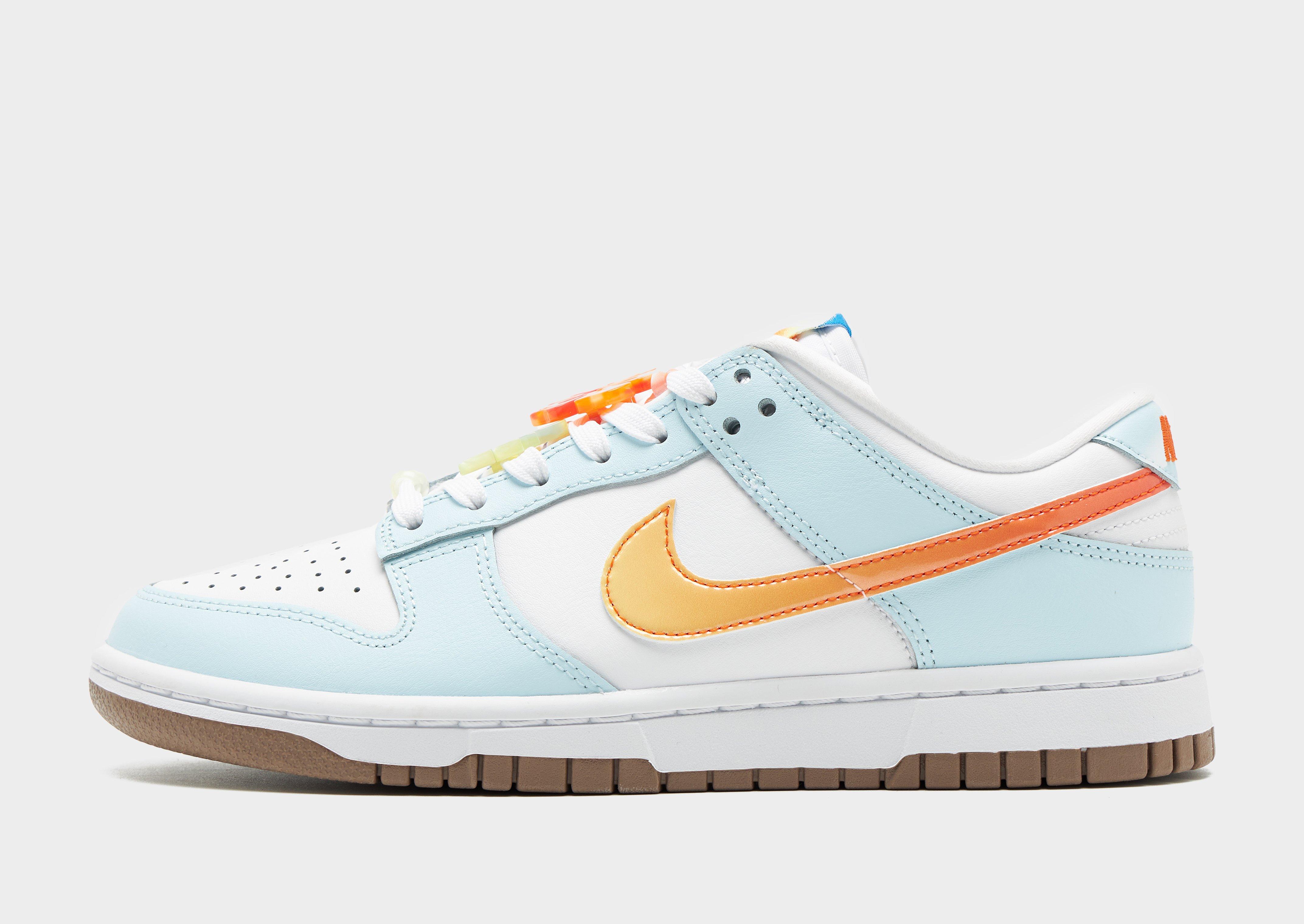 Inspired by b-ball style, these women's Dunk Low 'Beach Sunset' shoes from Nike are back from '85. These low-profile sneakers have a premium leather and synthetic upper keeping the OG design lines. They come in a White colourway with Blue details, and feature a tonal lace-up fastening with decorative lace charms, including pearls, palm trees, and flowers. With breathable perforations to the toe box, these shoes are sat on a soft foam midsole for lightweight cushioning and maximum comfort. Finished with a grippy rubber tread for traction on the courts, signature Nike branding and the iconic Swoosh logo to the sidewalls. Style Code: IB8877-191