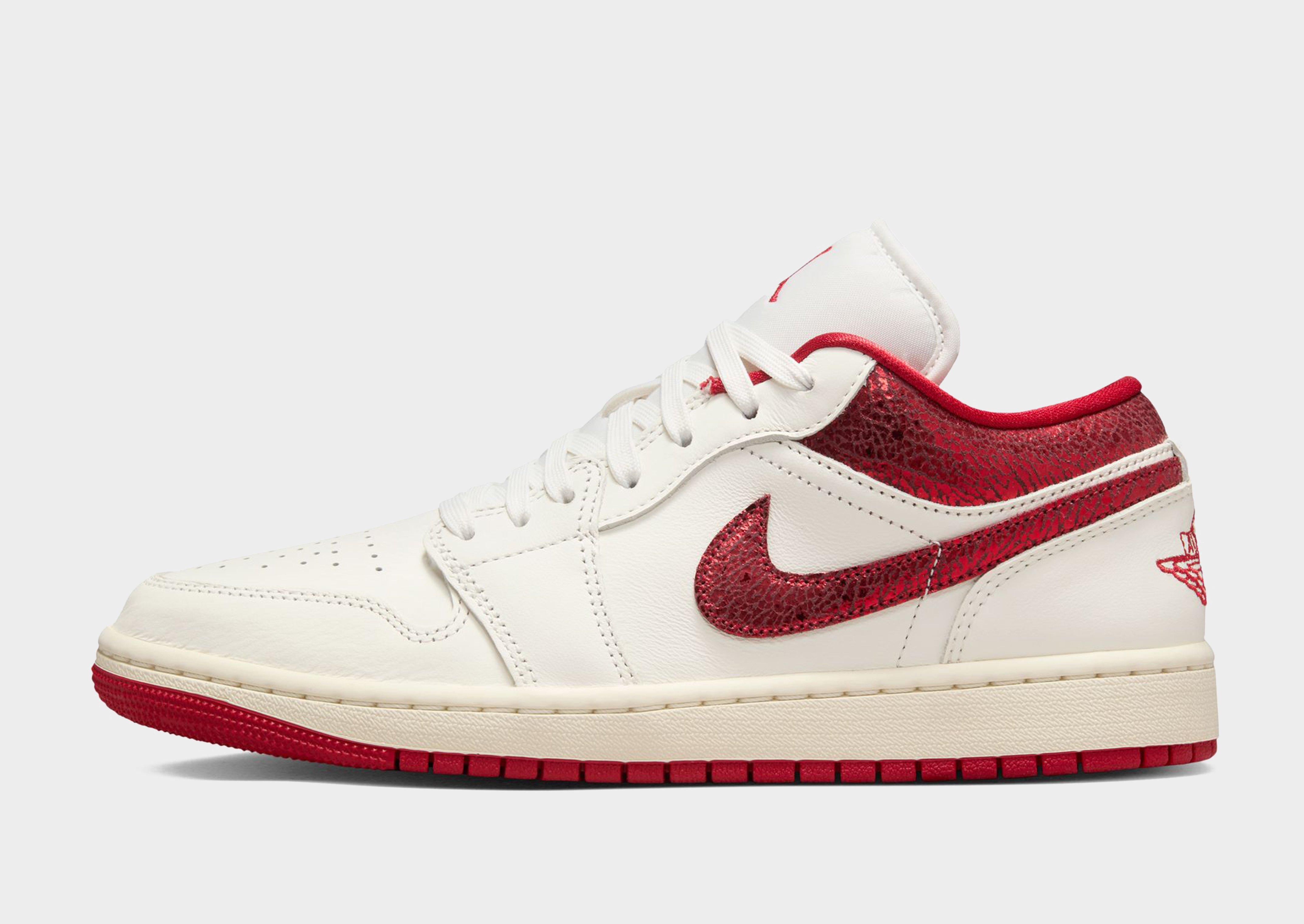Keep your rotation iconic with the epitome of sneaker culture: the Air Jordan 1 Low. Born from the collaboration between Nike and basketball legend Michael Jordan in 1985, the AJ1 changed the game forever, shattering conventions with bold colours and silhouettes. In a Sail colourway with Metallic Red details, these low-top shoes are crafted from a leather, synthetic leather and textile blend across the upper for support. Underfoot, the foam midsole combines with Nike Air cushioning for lightweight comfort, while the durable rubber outsole has pivot circles for retro-inspired traction. With a padded ankle collar and perforations on the toe, these kicks are finished off with the Swoosh and Air Wings logo to the sidewalls and the iconic Jumpman to the tongue. Decades later, the AJ1 remains an icon of style and athleticism, transcending generations with its timeless design and legendary status. Style Code: HJ9338-106
