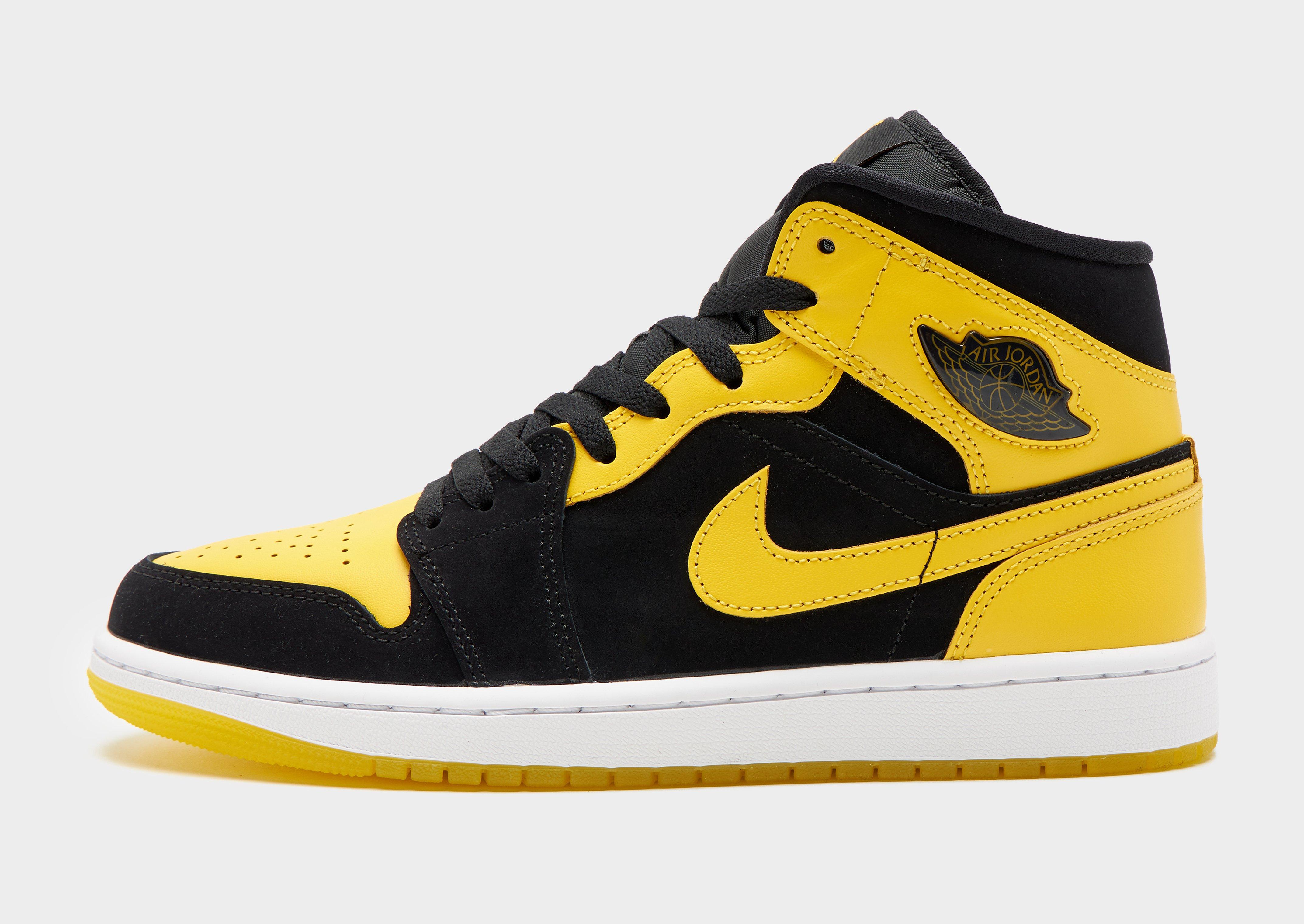 Keep your rotation iconic with the epitome of sneaker culture: the Air Jordan 1 Mid. Born from the collaboration between Nike and basketball legend Michael Jordan in 1985, the AJ1 changed the game forever, shattering conventions with bold colours and silhouettes. In a Black colourway with Yellow details, these mid-top shoes are crafted from a leather, synthetic leather and textile blend across the upper for support. Underfoot, the foam midsole combines with Nike Air cushioning for lightweight comfort, while the durable rubber outsole has pivot circles for retro-inspired traction. With a padded ankle collar and perforations on the toe, these kicks are finished off with the Swoosh and Air Wings logo to the sidewalls and the iconic Jumpman to the tongue. Decades later, the AJ1 remains an icon of style and athleticism, transcending generations with its timeless design and legendary status. Style Code: HJ6654-071