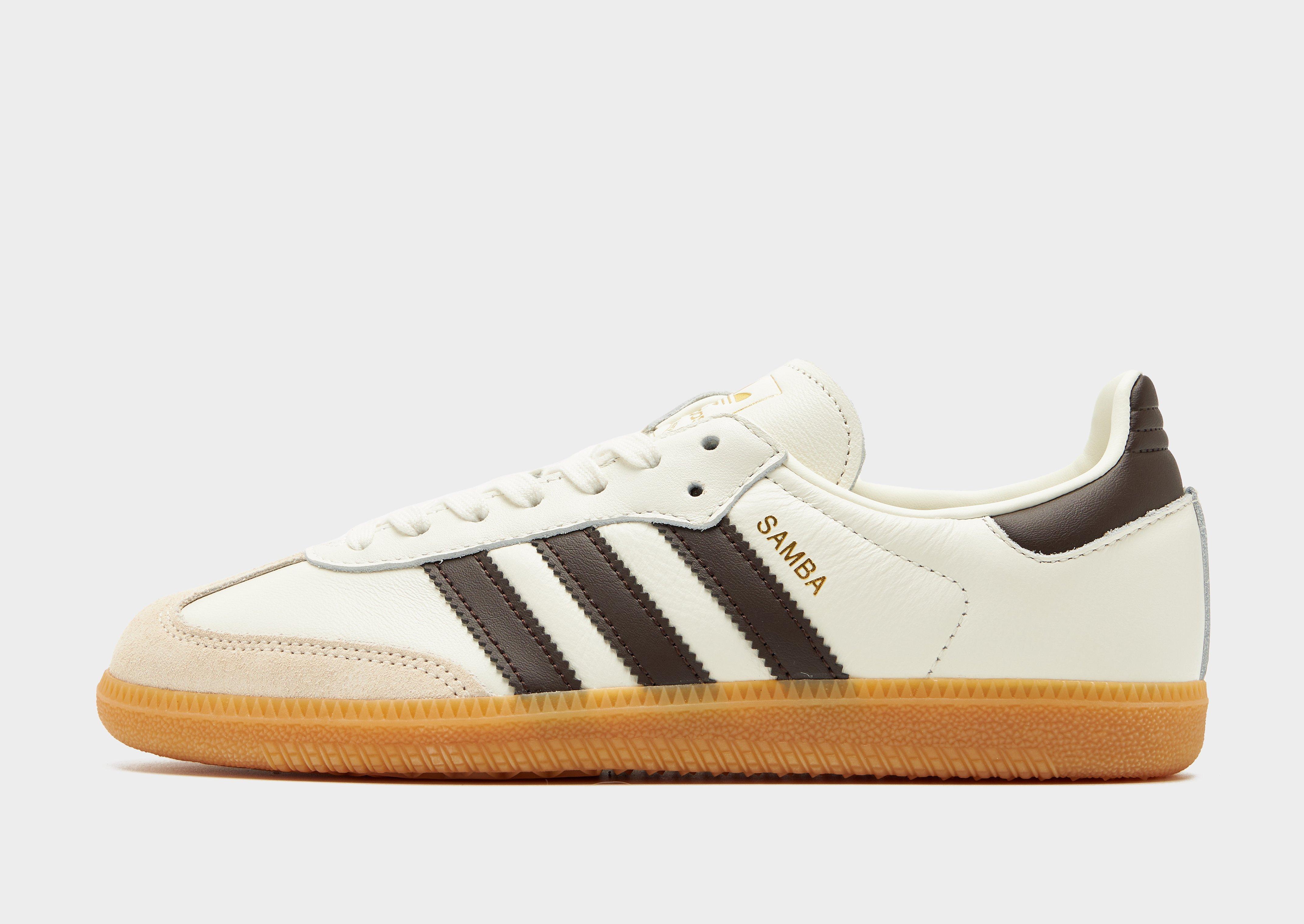 Add a streetwear icon to your footwear rotation with these men's Samba OG shoes from adidas Originals, exclusive to JD. Taking cues from the original football-inspired Samba design first introduced in the 1950s, these iconic terrace sneakers let you imagine you're walking in those vintage footsteps. Built with an Off White leather upper, they feature a suede toe guard and are sat upon a responsive gum midsole. With tonal laces and signature adi 3-stripes to the side in Brown, they're signed off with 'Samba' wording to the side, and iconic Trefoil branding to the tongue. Style Code: JQ1094