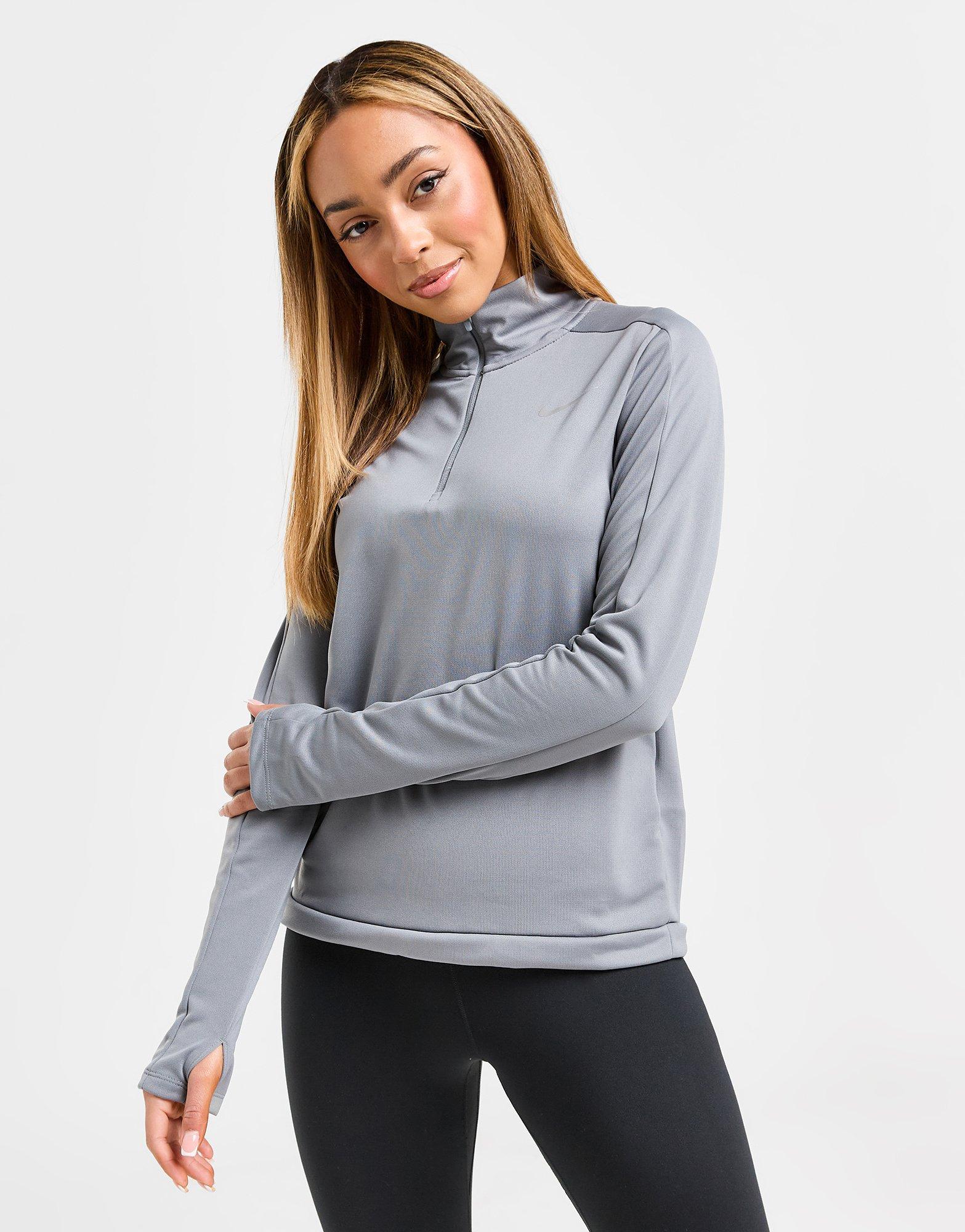 Get a staple added to your fitness wear with this women's Running Pacer 1/4 Zip Dri-FIT Track Top by Nike. In a Smoke Grey colourway, this top is made from a lightweight poly fabric that uses sweat-wicking Dri-FIT tech for cool comfort. It features 1/4 zip fastening with a stand-up collar for custom coverage, while thumbholes keep the long sleeves in place. Signed off with the Swoosh to the chest. Machine washable. | Our model is 5'8" and wears a size small.