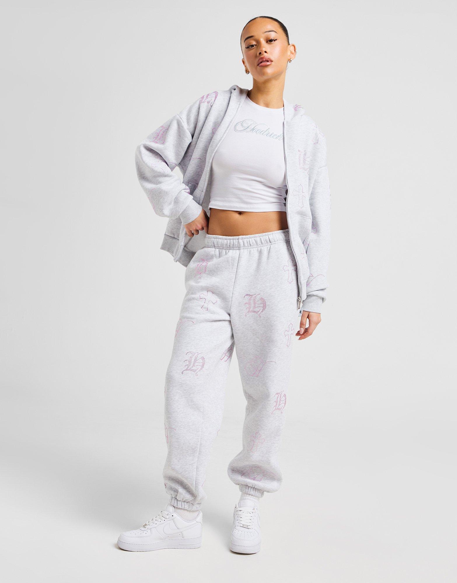 Exclusive to JD. From sofa chills to coffee dates, these women's Crystal Cuff Joggers from Hoodrich make a statement. In a Light Grey Marl colourway, these regular-fit joggers are built from comfy cotton blend for a fleecy and warm feel. They have an adjustable tie to the elasticated waistband and cuffed ankles to taper the leg. Finished off with open hand side pockets, a woven Hoodrich label and shiny rhinestone graphics all over. Machine washable. | Our model is 5'8.5" and wears a size S.