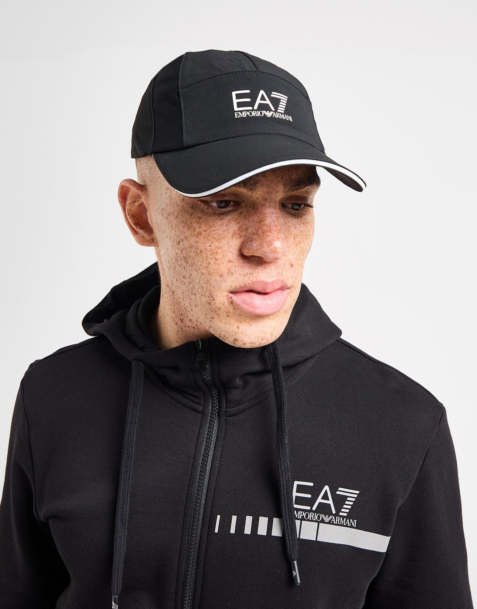 Add the finishing touch to your 'fit with this Tennis Pro Cap from EA7 Emporio Armani. In a Black colourway, this cap is made with a smooth, stretch-woven poly fabric for durable wear with a lightweight feel. It features a sleek, ergonomic cut with airy mesh inserts across the crown for added breathability. With a rigid, pre-curved visor for coverage and an adjustable back strap, it's signed off with a bold EA7 Emporio Armani logo up front.
