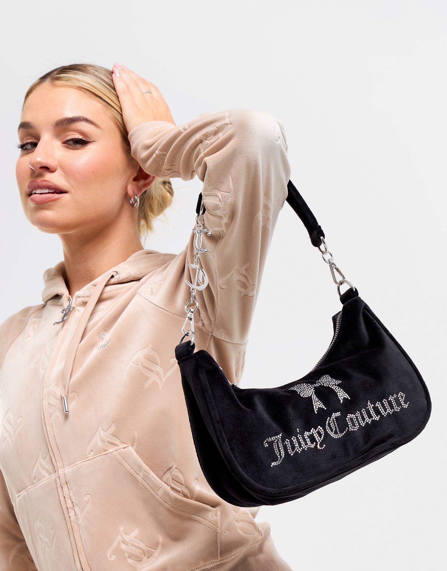 Carry your essentials in Y2K style with this women's Velour Shoulder Bag from Juicy Couture. Landing in a Black colourway, this handbag is made from velour material for that signature JC look. A main zipped compartment keeps all your belongings safe. Finished with a diamante Juicy Couture logo across the front, and branded metal hardware on the strap and zipper for an elevated look.