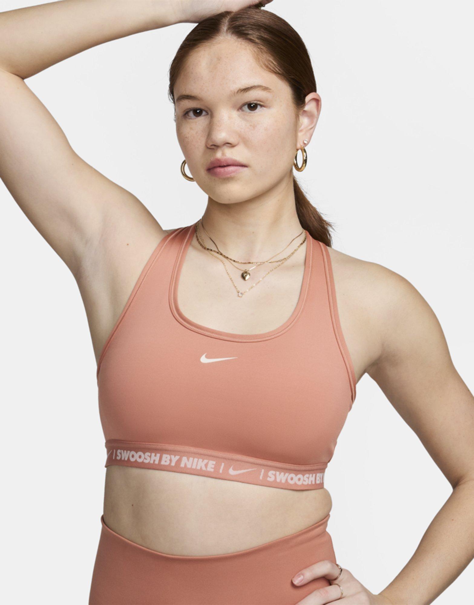 Start your fitness journey in style with this women's Training Swoosh Bra from Nike. Built for workouts, this Terra Blush sports bra is cut from ultra-stretchy and smooth polyester fabric. It has thick shoulder straps, a racerback design and an elasticated underband for support. Finished off with Swoosh By Nike wordmark branding around the band and the signature Swoosh logo to the chest. Machine washable.