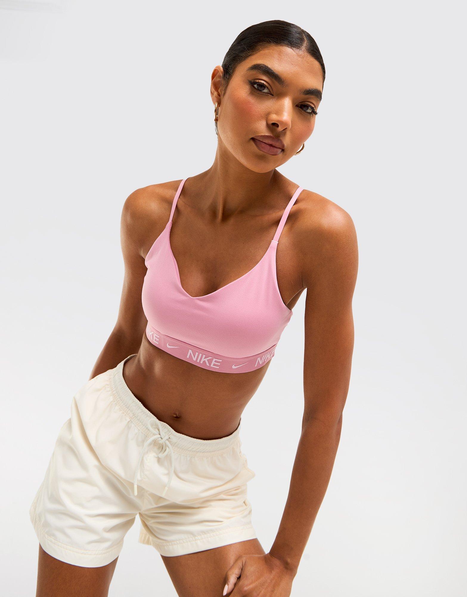 Work on your goals with this women's Training Indy Sports Bra from Nike. In a Light Pink colourway, this slim-fit sports bra is cut from light, stretchy poly fabric for flexible comfort. Equipped with sweat-wicking Dri-FIT tech to keep you fresh, it delivers light support to your workouts and has removable pads for a custom fit, and slim, adjustable shoulder straps for a sleek but secure look. With an underband for extra support, it's finished with signature Nike branding throughout. Style Code: FD1062-699