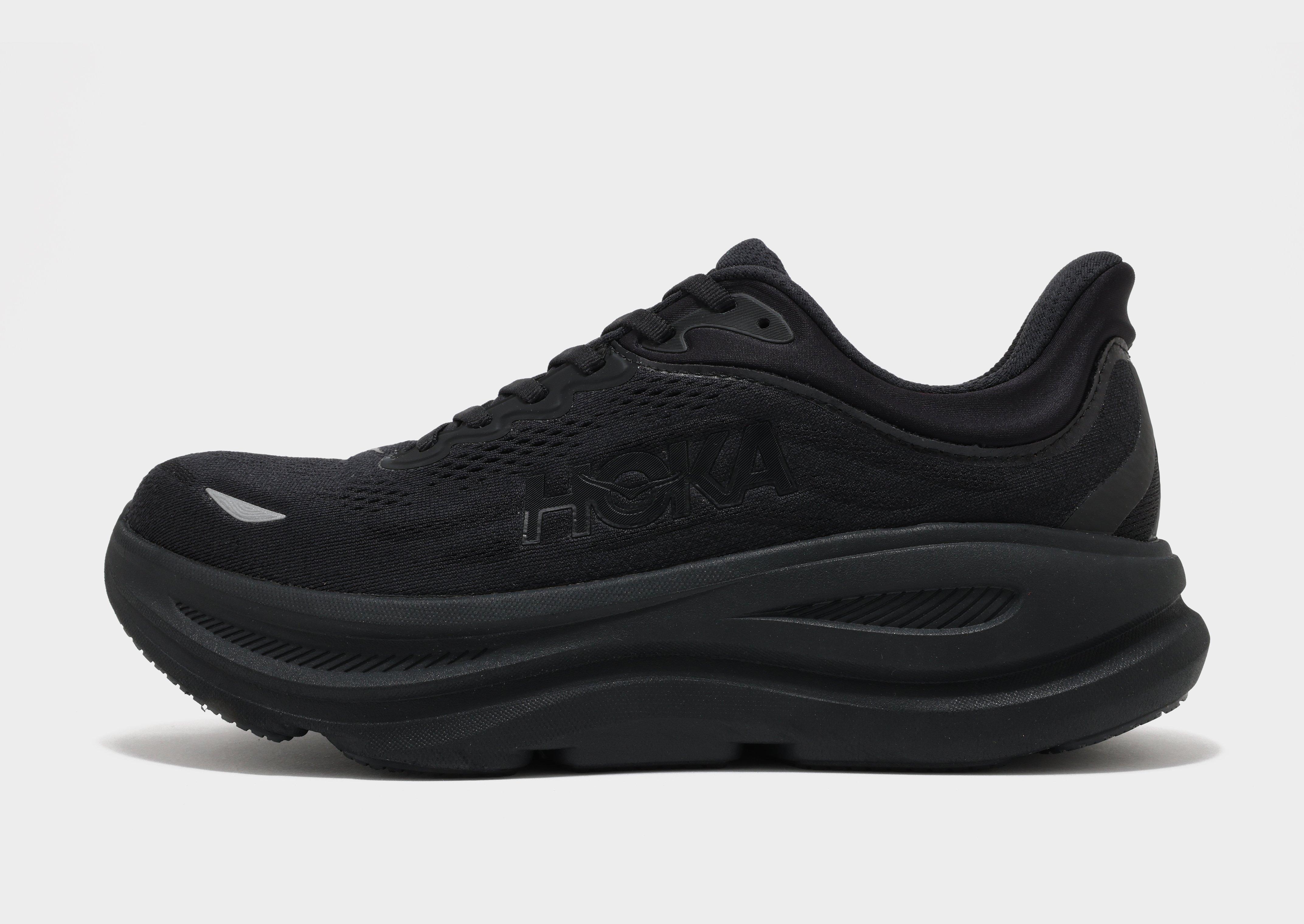 Make every mile count with these men's Bondi 9 running shoes from Hoka. In a Black colourway with tonal details, these runners are cut from light, breathable mesh in the upper that includes 50% recycled polyester. They feature a lace fastening to lock you in, with a padded collar for added support and an Ortholite sockliner for a snug fit. Underfoot, they sit on a chunky foam midsole for a smooth ride, with a grippy rubber outsole for traction. With heel tabs for easy on-and-off, they're finished up with classic Hoka branding. Style Code: 1162011-BBLC
