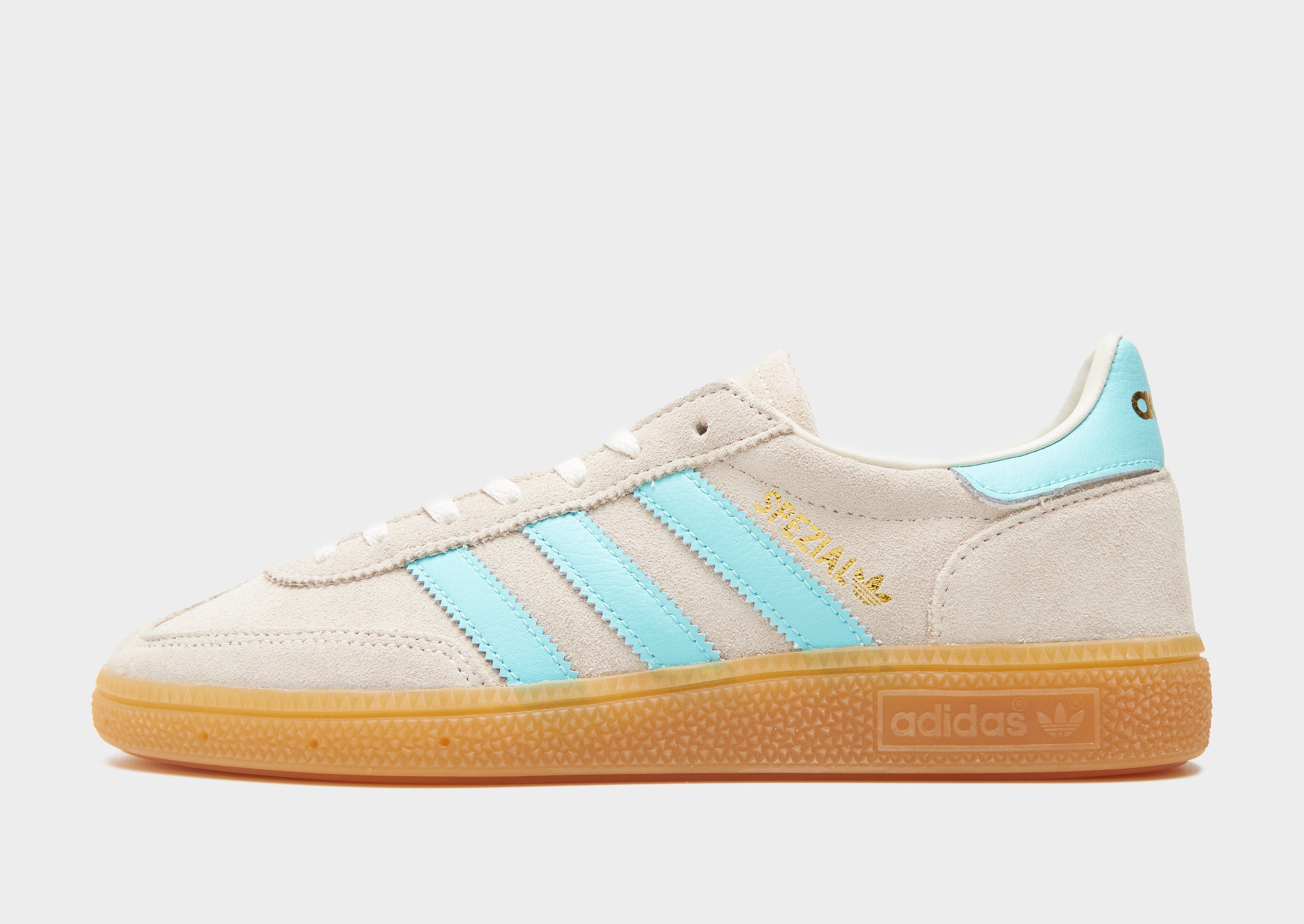 From the terrace to the street, rep a classic look with these women's Handball Spezial shoes from adidas Originals. First introduced in 1979 for the speedy handball courts of Germany, the simple yet stylish silhouette quickly made it a go-to, iconic trainer. Landing in an Off White colourway with Aqua Blue details, these JD-exclusive sneakers have an upper made with suede and nylon for durable wear. They feature a lace fastening with a padded ankle collar for a locked-in fit and sit on a lightweight midsole. With a gum rubber outsole for total traction, they're signed off with signature Adi 3-Stripes to the sidewalls. Style Code: JQ1099W
