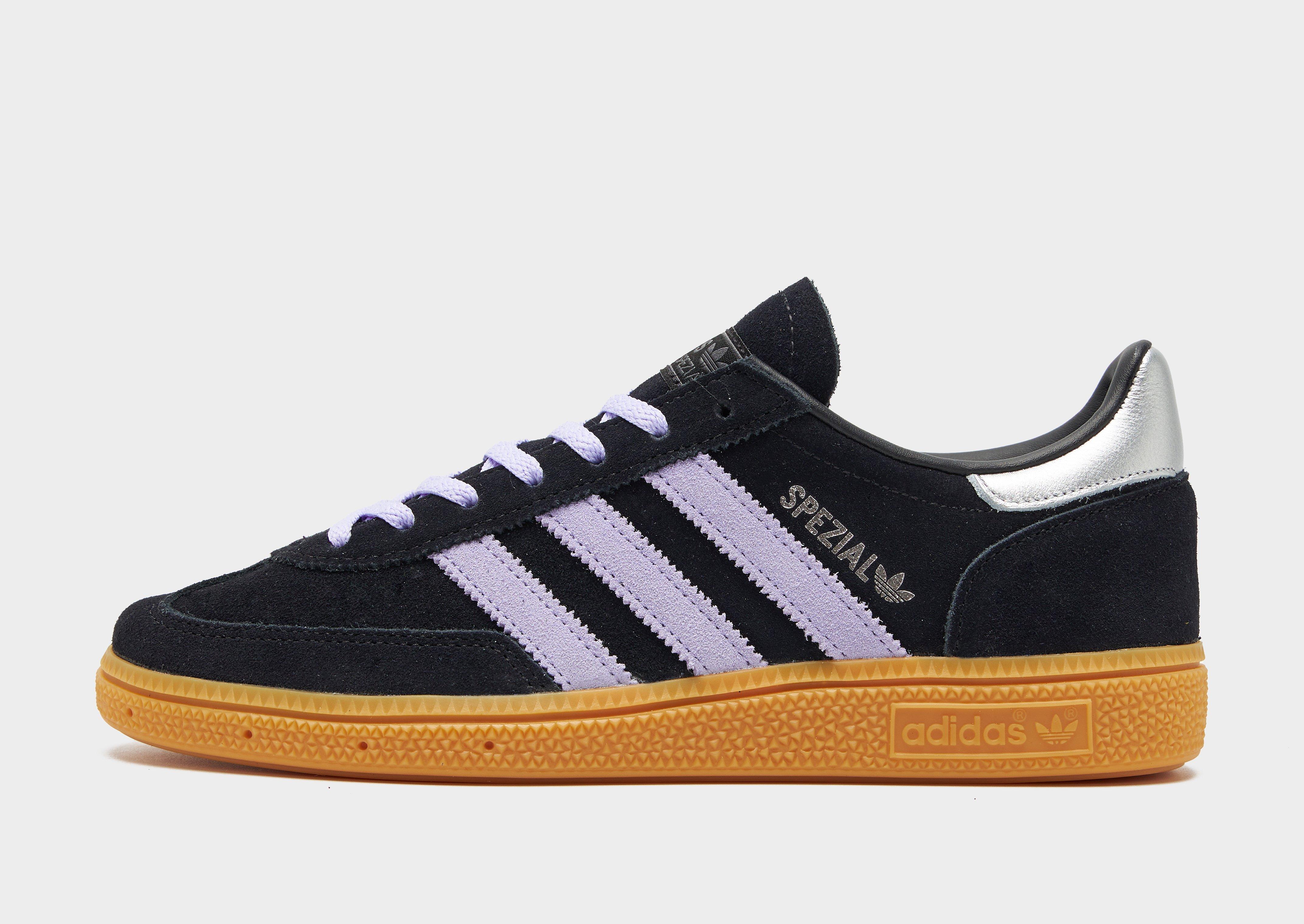 From the terrace to the street, rep a classic look with these women's Handball Spezial shoes from adidas Originals. First introduced in 1979 for the speedy handball courts of Germany, the simple yet stylish silhouette quickly made it a go-to, iconic trainer. Landing in a Black colourway with Purple details, these sneakers have an upper made with suede and nylon for durable wear. They feature a lace fastening with a padded ankle collar for a locked-in fit and sit on a lightweight midsole. With a gum rubber outsole for total traction, they're signed off with signature Adi 3-Stripes to the sidewalls. Style Code: JS2909