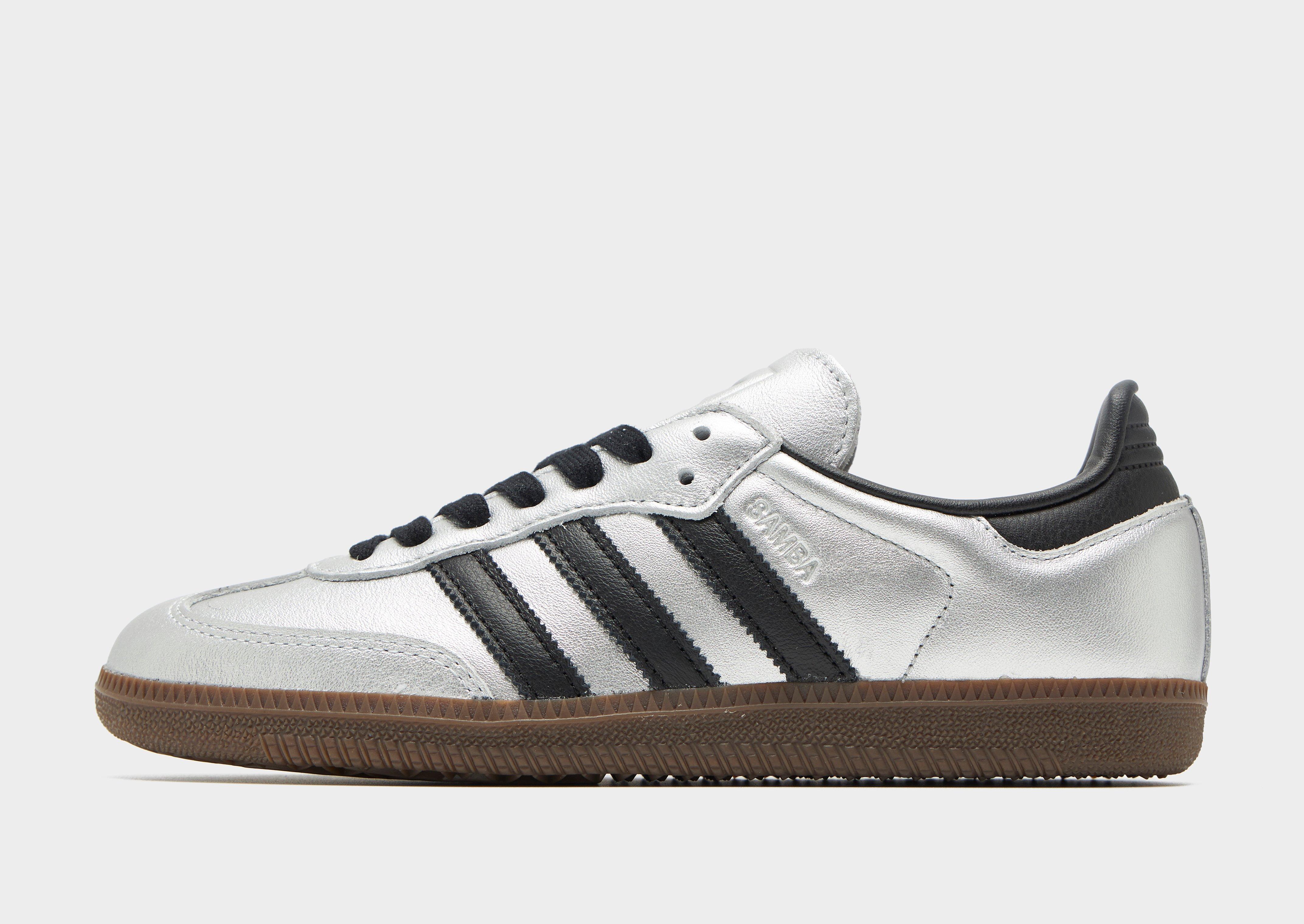 Add a streetwear icon to your footwear rotation with these women's Samba OG shoes from adidas Originals. Taking cues from the original football-inspired Samba design first introduced in the 1950s, these iconic terrace sneakers let you imagine you're walking in those vintage footsteps. Built with a Silver leather upper, they feature a contrasting suede toe guard. Sat upon a responsive gum midsole, the shoes feature tonal laces and signature adi 3-stripes to the side. Signed off with golden 'Samba' wording to the side, and iconic Trefoil branding to the tongue.