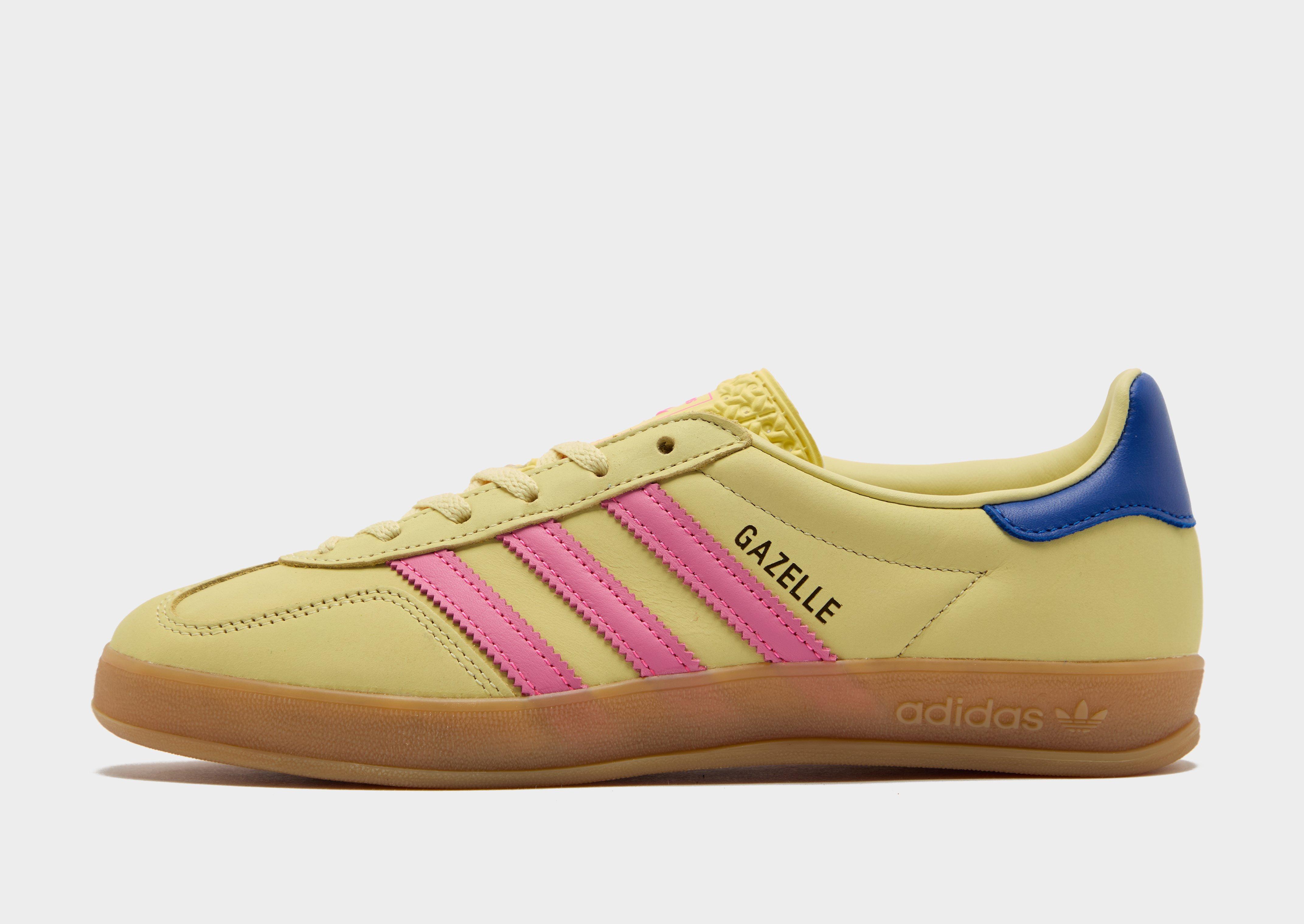 Bold energy and timeless style combine with these women's Gazelle Indoor sneakers from adidas Originals. In a Powder Yellow colourway with a Team Royal Blue heel tab, these low-profile icons have a plush nubuck upper and textured synthetic tongue. Sat on a cushioned insole and the translucent gum rubber outsole, they're finished off with serrated 3-Stripes in Lucid Pink and the Gold Gazelle wordmark. | JI2719