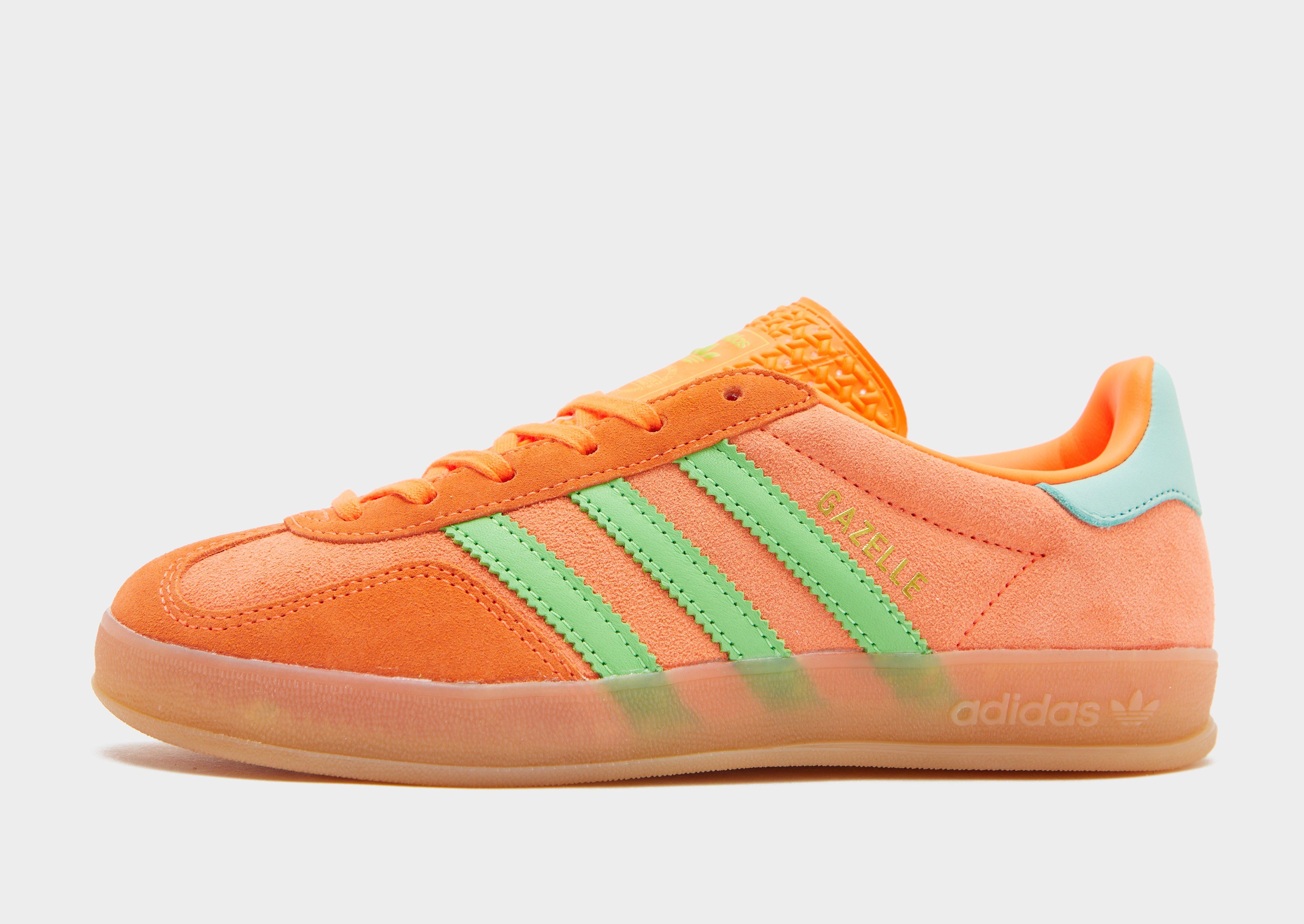 Make a statement in these women's Gazelle Indoor trainers from adidas Originals. In a Solar Orange colourway with Clear Mint and Solar Green accents, these archive-inspired treads have a soft suede upper with the iconic T-toe cap for a classic look. They feature a tonal lace fastening with qa low-profile collar for a secure fit. With light cushioning underfoot for all-day comfort, they have a grippy gum rubber outsole for traction. Signed off with classic adidas Originals branding throughout. | JQ0193