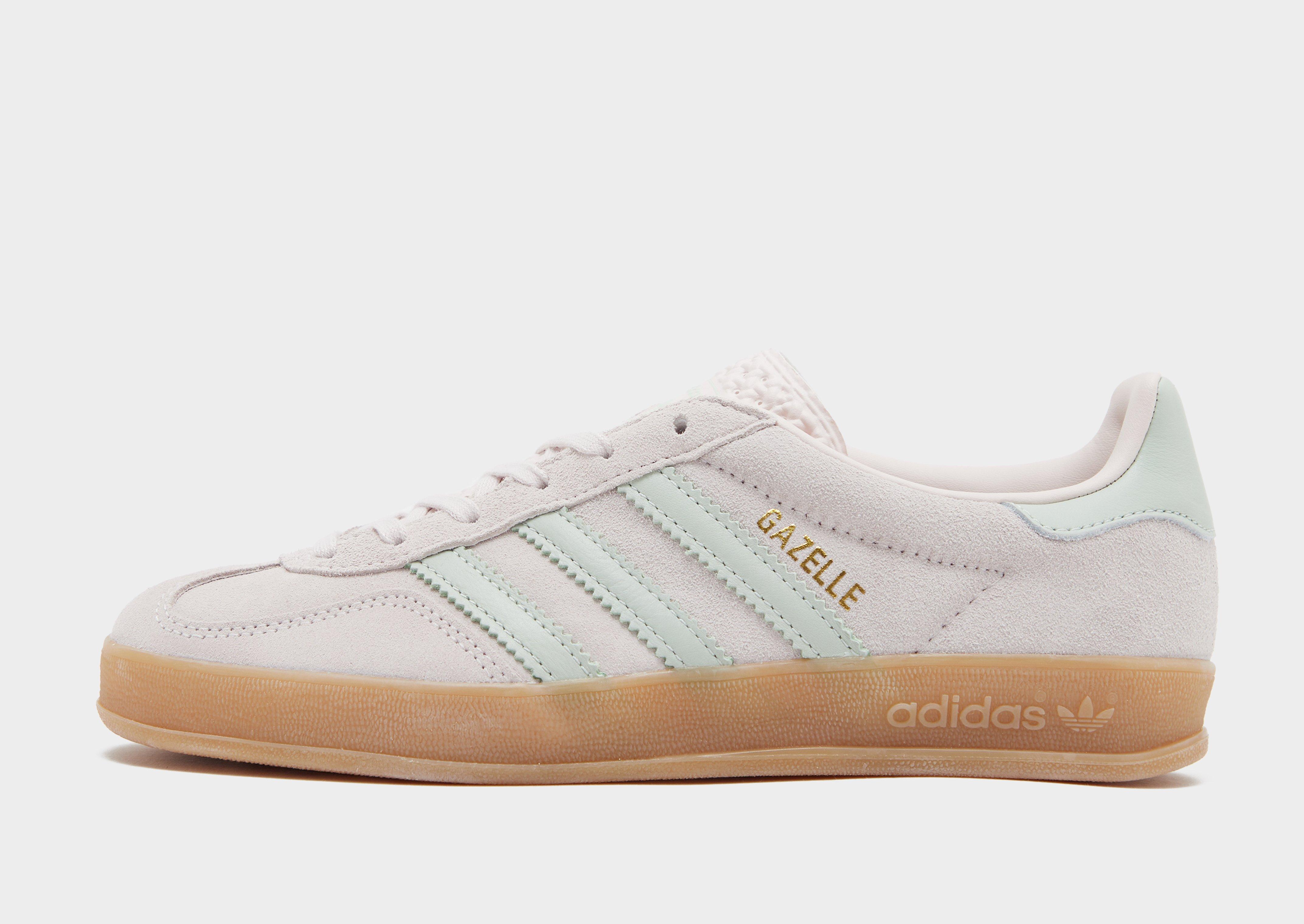 Freshen up your kick collection with these women's Gazelle Indoor trainers from adidas Originals. In a Putty Mauve, Linen Green and Gum 3 colourway, these JD-exclusive sneaks have a smooth synthetic and leather upper with a T-toe design for a premium feel. They feature a lace fastening and a padded collar to keep you locked in, with a cushioned midsole for a responsive ride. Sat above a grippy rubber outsole, they're signed off adidas Originals branding on the tongue, with Gazelle wordmark and serrated 3-Stripes to the sidewalls. | JR3367