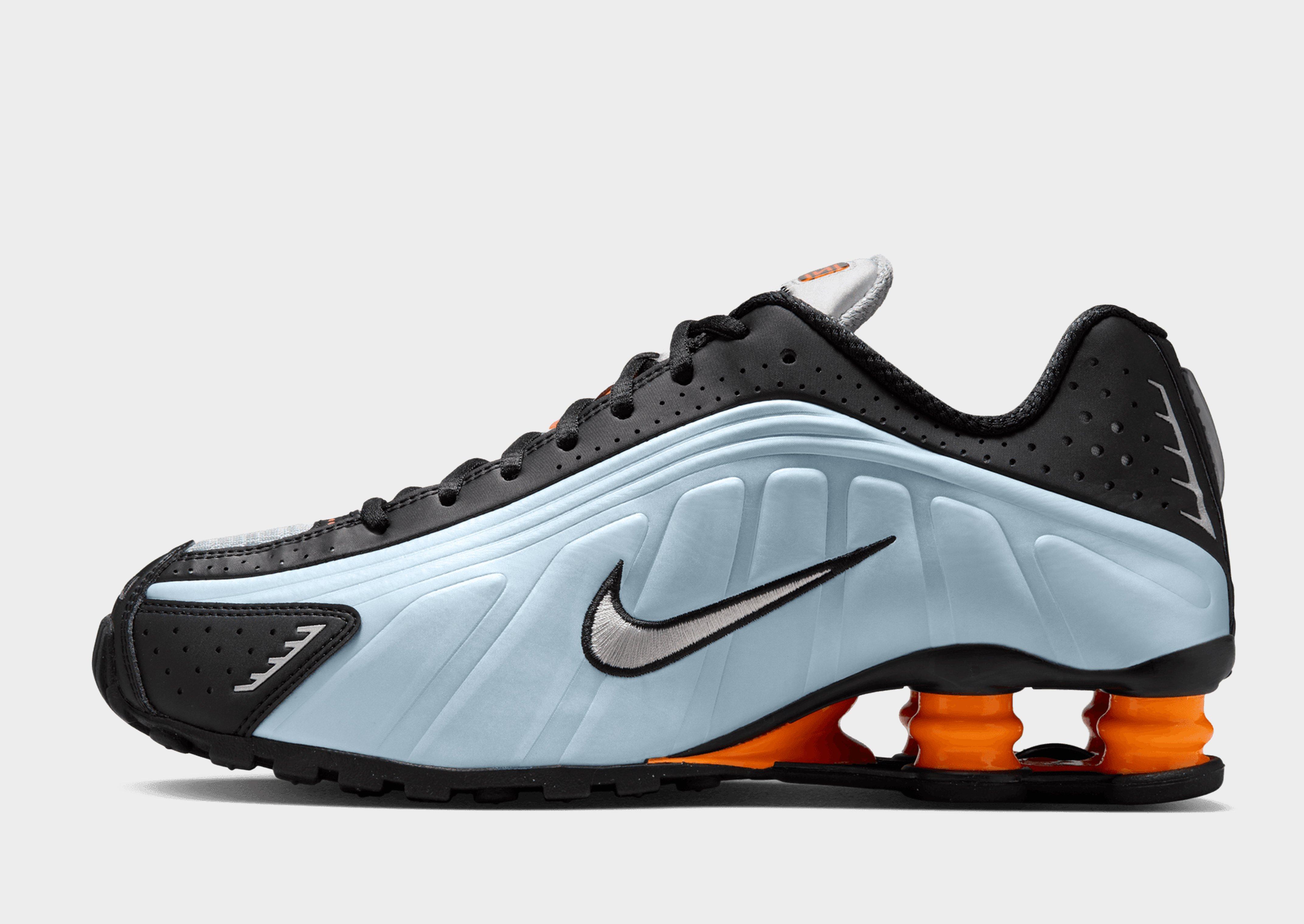 Retro but futuristic, these women's Shox R4 sneakers from Nike bring back the 2003 icon in its OG form. In a Blue colourway with Black details, these statement shoes are built with a breathable mesh upper that features glossy TPU overlays and a tonal lace up fastening for a locked-in fit. Nike's iconic Shox tech sits underfoot, with a full-length midsole of springy Shox columns for a super comfy feel. With a grippy rubber sole, these trainers are finished with Shox branding to the tongue and the signature Swoosh logo embroidered to the sidewalls. Style Code: AR3565-401