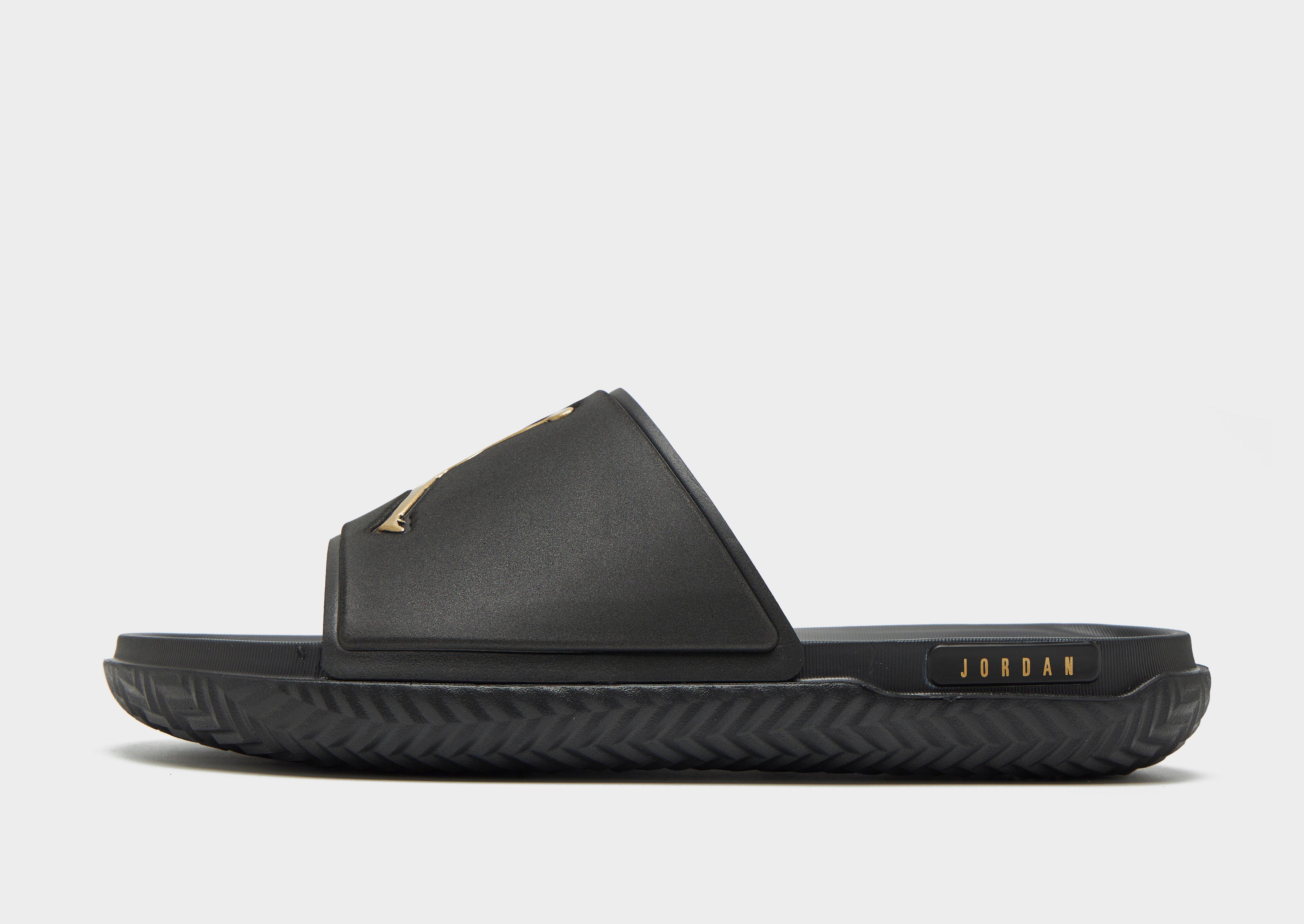 Step out in these men's Jumpman Slides from Jordan. In a Black colourway, these slides are cut from durable synthetic material and have a padded strap for a secure fit. They have a textured footbed for a smooth step and herringbone grip for traction. Finished up with the classic Jumpman logo.
